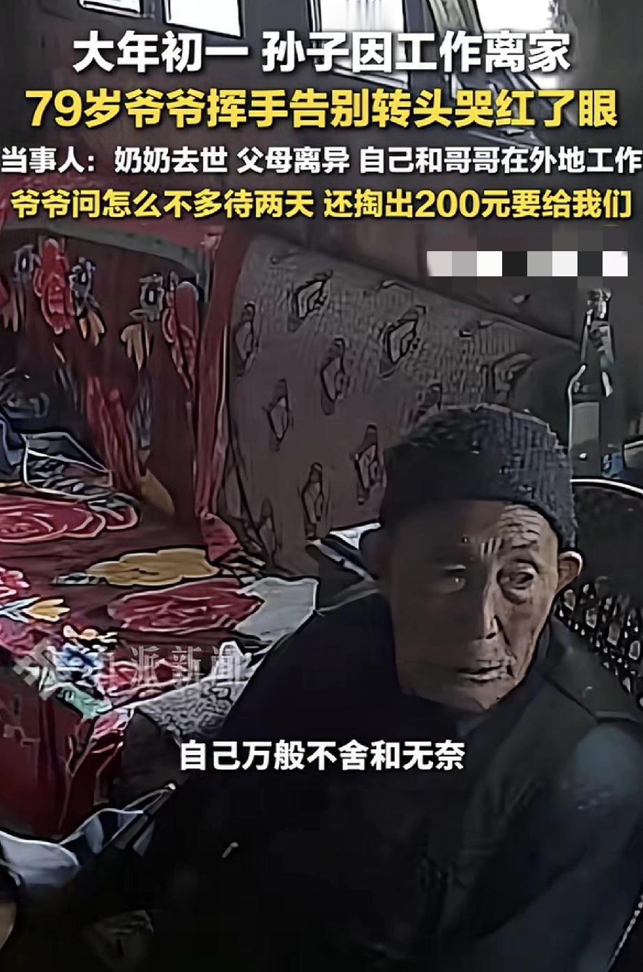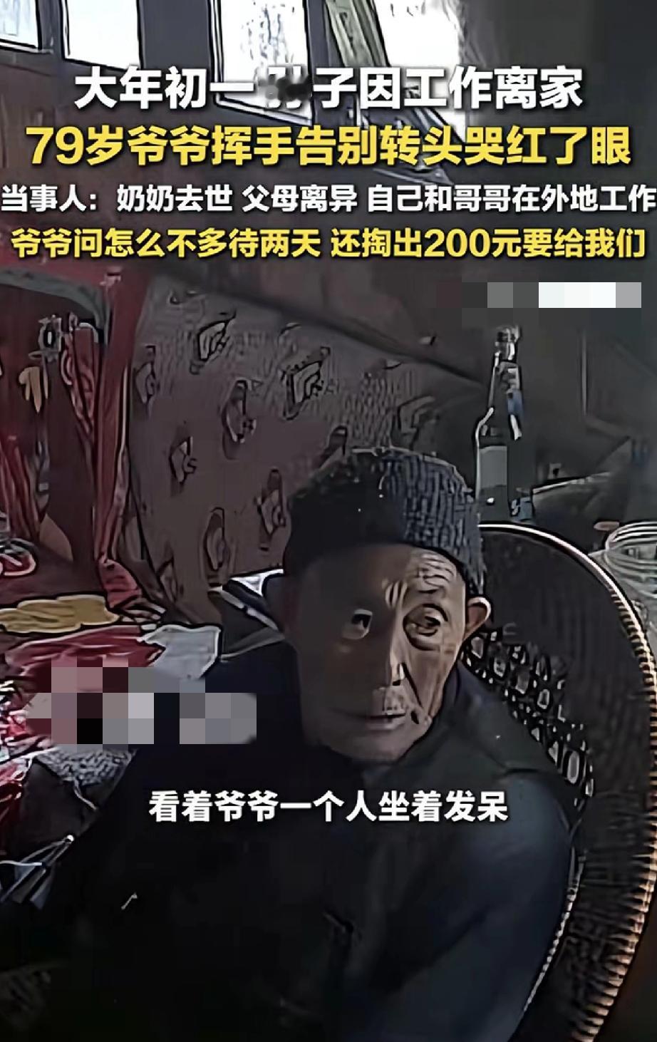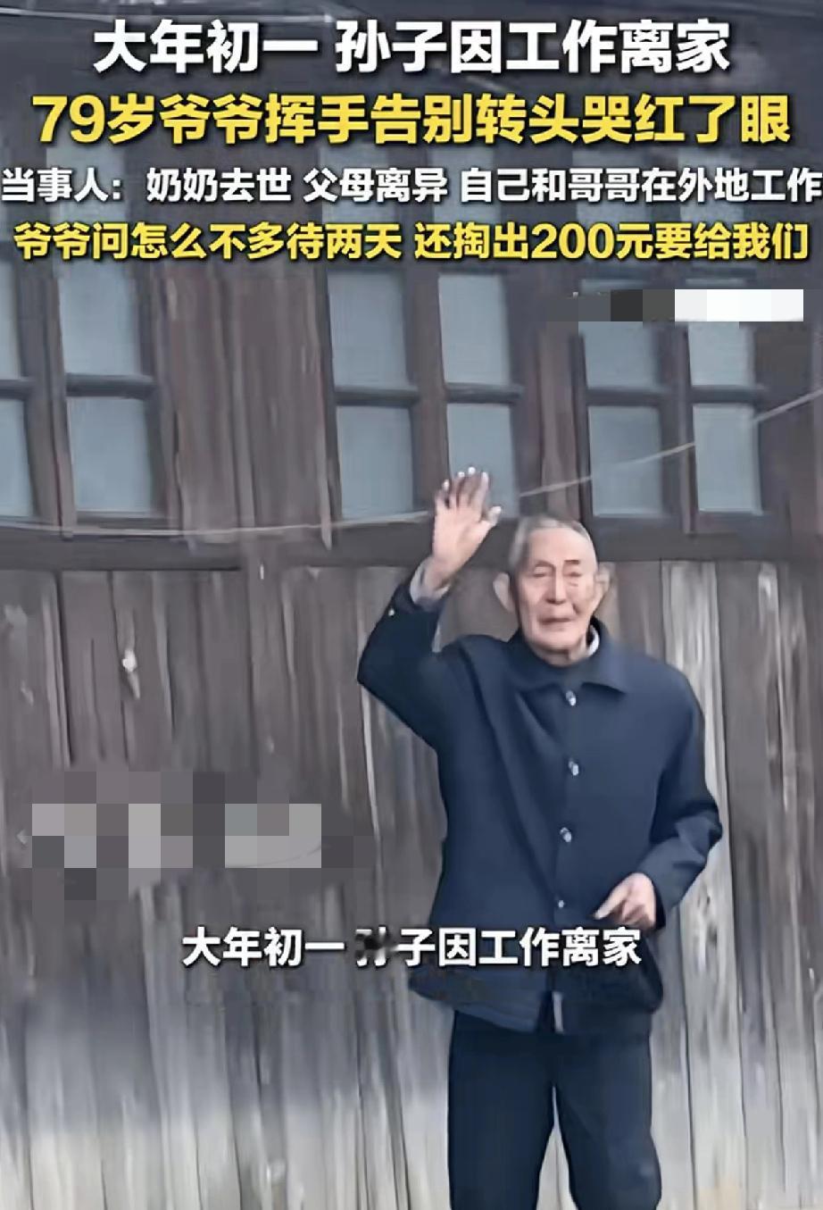 心酸。贵州遵义,一男子大年初一无奈要离家工作,临走时,男子爷爷在家门口目送痛哭的一幕,让男子心酸不已。之后男子又通过监控,看着爷爷独自一人坐在家里发呆的模样时,再也忍不住的泪目了。 据男子介绍,他的奶奶已经去世了,他父母也已离异,为了养家糊口,他和哥哥一直在外地工作,留得爷爷独自生活。虽然平时男子也会通过监控,陪爷爷聊聊天说说话,但爷爷还是非常想念他们,他们也非常担心爷爷。 而今年又因工作原因,他和哥哥不得不大年初一就要回去上班。当男子临走时,将此事告诉爷爷后,爷爷也是不舍问道怎么不多待两天,说着说着爷爷就哭了起来。 视频可见,男子和哥哥无奈离开家时,爷爷满眼心疼的在门口目送他们,当看到他们离去时,爷爷又忍不住的哭了起来。 此时男子和哥哥心里也是五味杂陈,虽然他们也万般不舍,但为了生活,他们也是无可奈何。 更让男子心酸的是,之后男子通过查看爷爷情况,却看到爷爷一个人坐在屋里发呆,此时此刻,男子再也没忍住的泪流满面了。 对此男子也决心,以后一定要多挣钱,有时间多陪陪爷爷,带爷爷出去玩,尽可能把爷爷带在身边。 不得不说,看着爷爷泪流满面,对孙子不舍送别的模样时,让人心酸泪目了。一年到头,爷孙可能都见不上两面,好不容易有个团圆新年,孙子却又因工作原因不得不赶回去上班。 可以想象,特别是过年时节,这也是老人对亲人团聚的一种极大期盼,此时爷爷是有多么舍不得孙子们离去。因为爷爷心里知道,这一挥手又怕要等一年,怕没几个一年再等了。 或许正如网友所说,成年人有太多的不易和无奈,如果能把爷爷带在身边该多好啊,希望当地政府能够看到,让这留守老人也能老有所依,有时尽孝也需要政府的帮助呀! 对此大家怎么看?