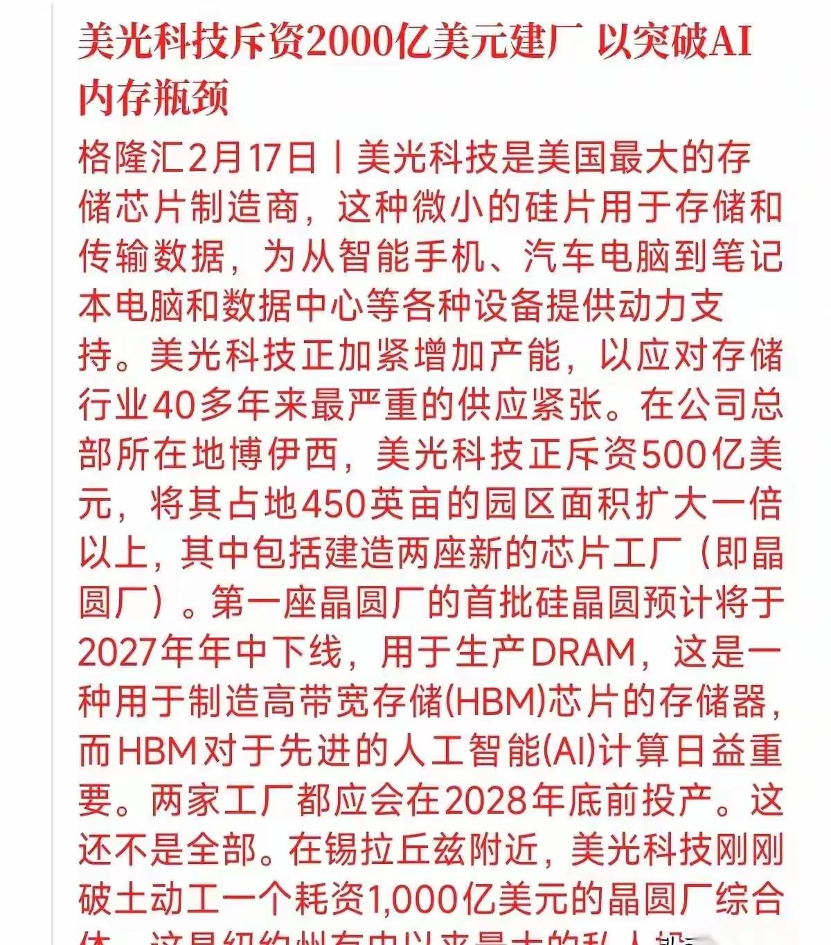 美光科技拆资2000亿美元在美国本土建AI内存储工厂,以解决内存芯片的短缺问题!已解决汽车,手机,电脑,数据中心各种芯片的短缺问题!主要是应对这40年以来内存芯片的短缺局面! 全球主要是因为AI人工智能的发展导致大批量的芯片短缺! Open AI,也正在敲定1000亿美元的投资项目!自从AI人工智能的发展确实会带来更多的技术性的突破!很多大型AI公司加大对AI人工智能的投资!主要是看到未来AI人工智能发展的潜力