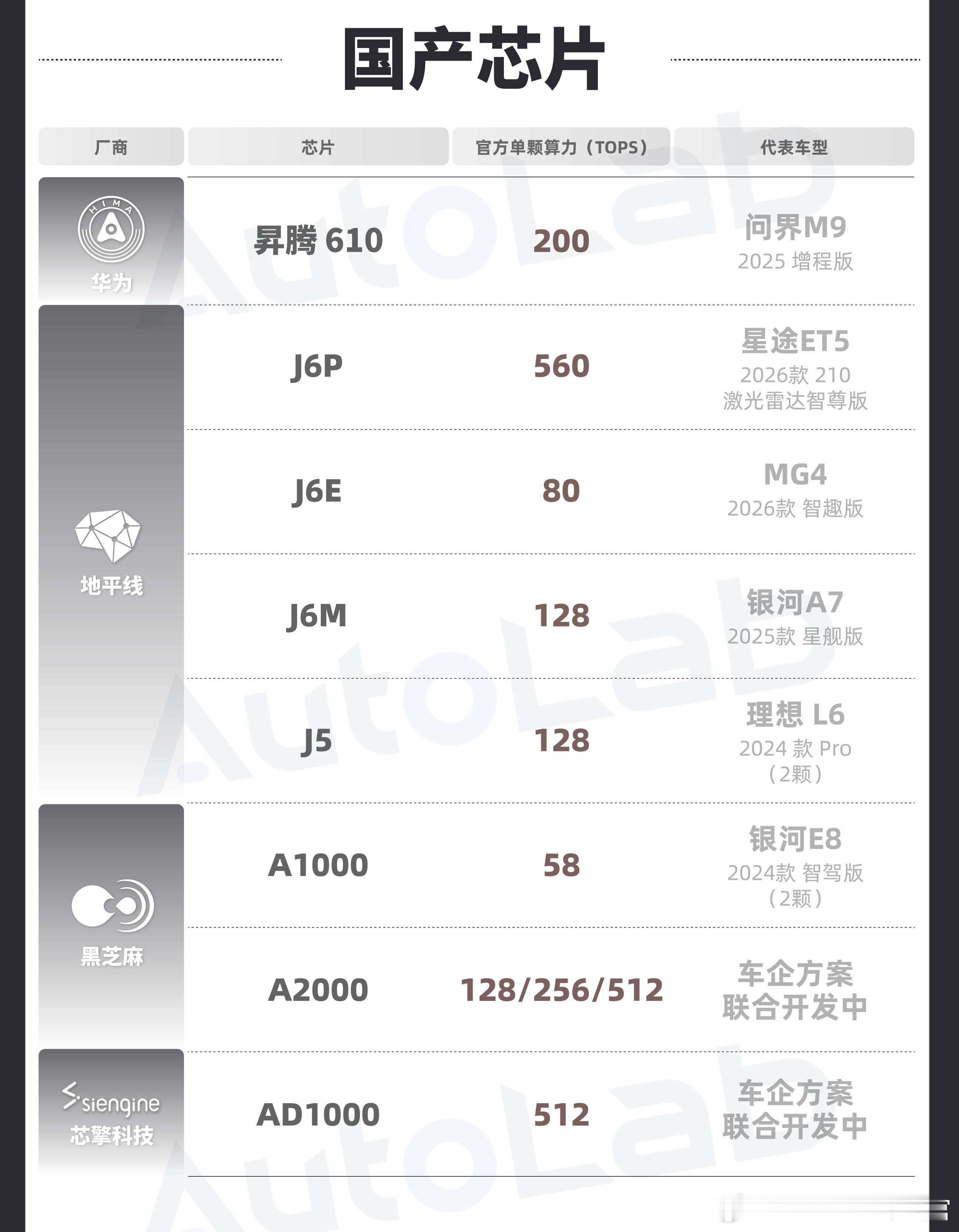 为了方便大家对市面上的芯片有更多的了解,我们整理了目前比较主流的芯片产品以及对应的算力和代表车型