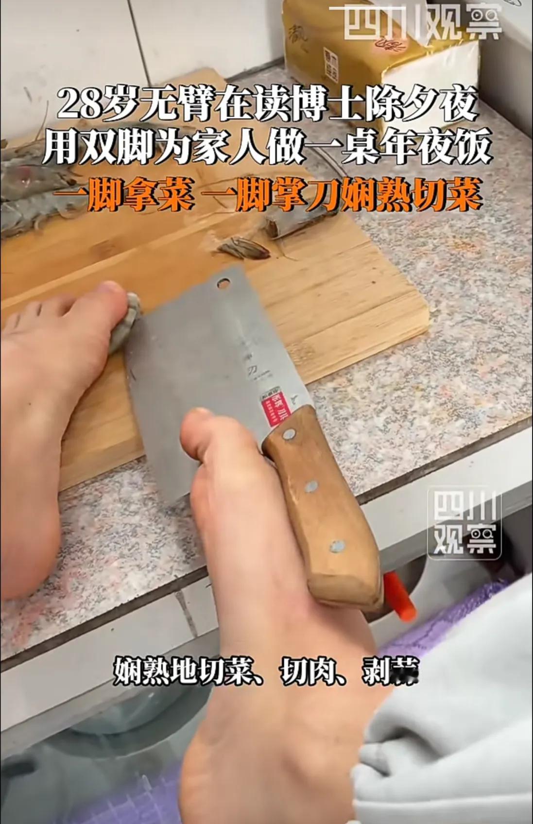 强者从不抱怨环境!2月17日,28岁无臂博士用双脚为家人做年夜饭已练习做饭两年