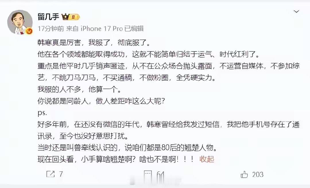留几手2月20日发文狂赞韩寒,直言“彻底服了”!因《飞驰人生3》票房破17亿、导演总票房超90亿,韩寒不炒不综艺、全凭硬实力出圈。他还自曝经叫兽易小星牵线,韩寒多年前曾主动给他发短信,自己存着号码却从未打扰,自嘲当年被称作“80后翘楚”如今差太远。这波“毒舌”变迷弟,太真实!