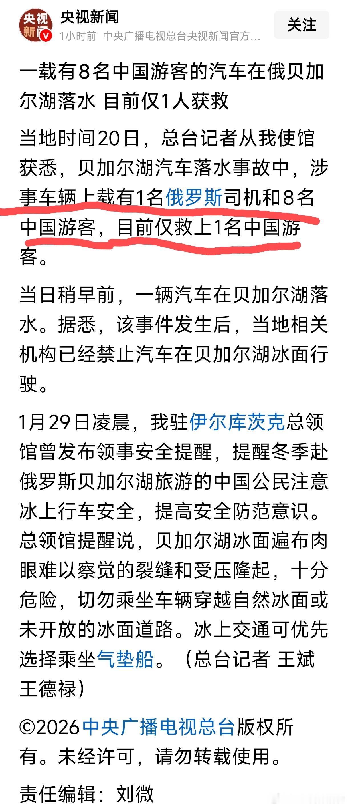 一载有8人汽车在贝加尔湖沉没 总共9人=1司机(俄罗斯)+8乘客(中国)事发地:奥利洪岛,气温-8℃ ~ 7℃,当前约 0℃涉事车辆为: UAZ面包车(9座)贝加尔湖汽车落水1名中国游客获救愿还能够抢救出来 7名中国游客沉入贝加尔湖溺亡已经没有机会啦