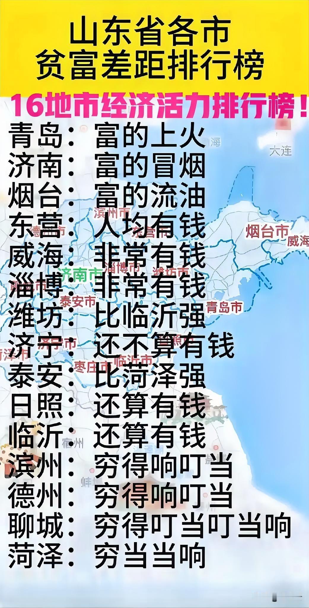 山东省各地市经济差距排行榜揭秘!山东16市经济差距大曝光:青岛富上火,烟台富流油,济南富冒烟!速速围观揭秘详细内容![大金牙][大金牙][招财进宝][招财进宝] 2025山东各市GDP榜单炸场,贫富差距主打一个真实,梯队分明、画风爆笑,堪称齐鲁版凡尔赛修罗场。[大笑][大笑] 青岛以1.75万亿断层C位,富到上火,妥妥鲁省顶流天花板;济南1.42万亿强省会发力,富到冒烟,一路狂飙猛追;烟台1.13万亿增速领跑全省,富得流油,硬核搞钱不声张。[礼物][礼物][赞][赞] 潍威淄等中部城市稳健发育,属于佛系小康;临沂、菏泽人口红利拉满,总量逆袭;东部沿海稳扎稳打,鲁西南、鲁西北仍在蓄力爬坡。[捂脸][捂脸] 整张榜单写满现实:三核领跑、腰部稳健、尾部追赶。山东经济从不玩虚,谁产业硬、增速猛,谁就能站上财富C位。 欢迎关注@叮咚云 将优先为粉丝职业规划指导,1对1咨询是付费服务,为你定制最适合的就业择业方案!欢迎留言交流讨论。[来看我][来看我] 免责声明:图片来自网络,仅供参考! 山东企业 青岛企业百强 山东企业名录