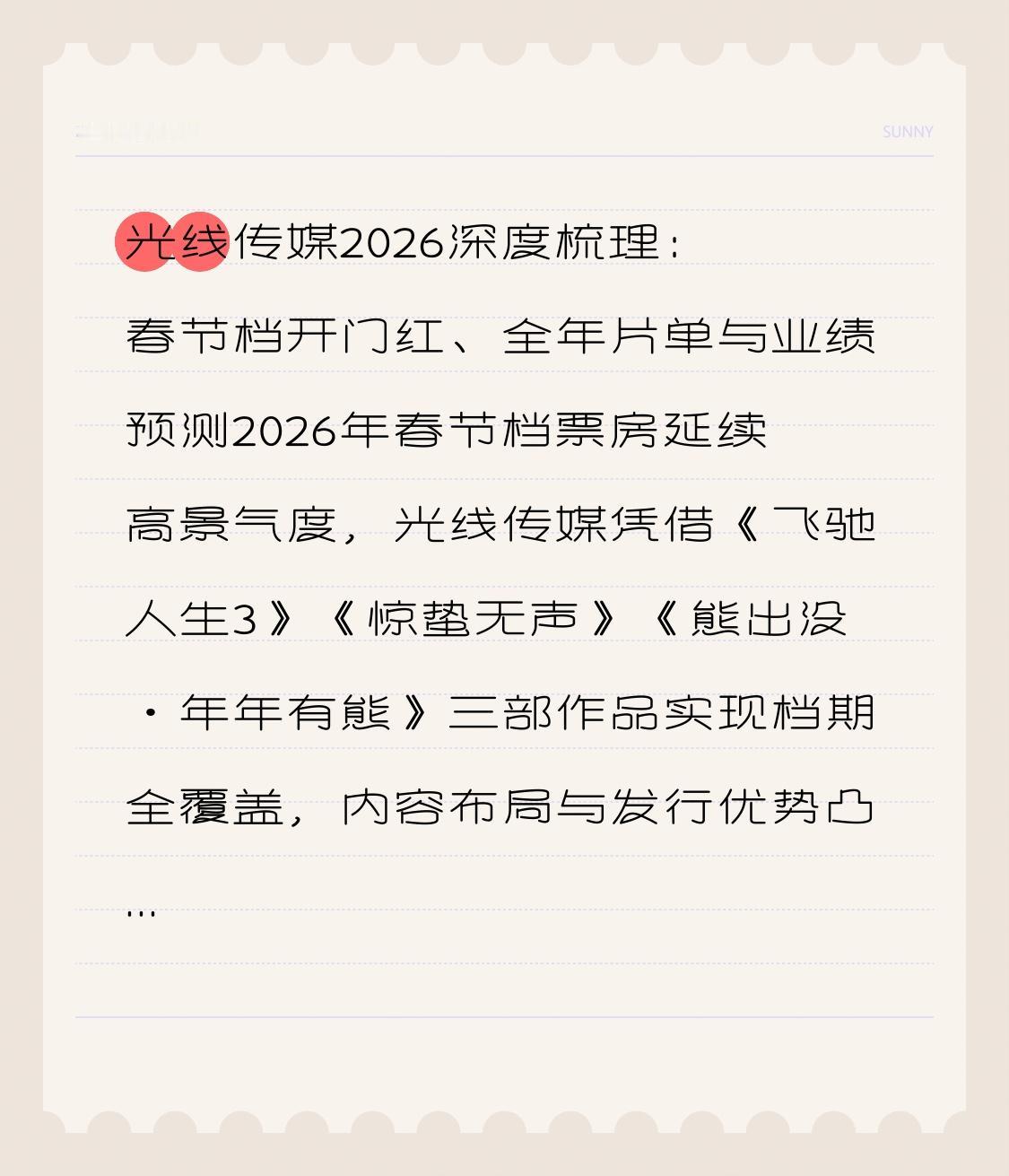 光线传媒2026深度梳理:春节档开门红、全年片单与业绩预测 2026年春节档票房延续高景气度,光线传媒凭借《飞驰人生3》《惊蛰无声》《熊出没·年年有熊》三部作品实现档期全覆盖,内容布局与发行优势凸显,成为春节档核心受益标的。 公司2026年正式步入内容供给大年与IP价值释放期,本篇从档期收益、片单规划、业绩测算、成长逻辑四大维度,全面梳理公司投资价值。 一、春节档票房兑现:业绩底已夯实 公司通过主投、参投、发行多维参与春节档,结构均衡、收益确定性较强,已锁定2026年一季度业绩高增长。 1. 《飞驰人生3》:联合出品+参股猫眼间接受益,投资占比8%-16%,票房预期35-40亿元,贡献净利润2.5-3.0亿元。 2. 《惊蛰无声》:核心参投+主发行,投资占比15%-20%,票房预期25-30亿元,贡献净利润1.8亿元。 3. 《熊出没·年年有熊》:小份额参投,投资占比5%-10%,票房预期8-12亿元,贡献净利润0.3-0.6亿元。 春节档合计贡献净利润4.6-5.4亿元,一季度业绩高增具备强支撑。 二、2026全年片单:四大档期接力,动画与真人双轮驱动 公司全年计划上映12-15部影片,覆盖春节、暑期、国庆等核心档期,动画IP与现实题材协同发力,内容供给量质齐升。 已上映项目 《飞驰人生3》《惊蛰无声》《熊出没·年年有熊》 《熊猫计划之部落奇遇记》《重返·狼群》重映。 暑期档(Q3 核心爆发期) 1. 《镖人:风起大漠》:公司主控大制作国漫,武侠赛道标杆作品,票房预期14-20亿元,贡献净利润3.0-4.0亿元。 2. 《大鱼海棠2》:彩条屋经典IP续作,受众基础稳固,票房预期15-20亿元,贡献净利润3.5-4.5亿元。 3. 《三体》电影版:顶级科幻题材参投项目,票房预期30-40亿元,贡献净利润2.0-3.0亿元。 国庆档及年末(Q4 收官阶段) 1. 《姜子牙2》:彩条屋神话宇宙核心作品,票房预期20-25亿元,贡献净利润4.0-5.0亿元。 2. 《杨戬2》:工业化动画标准化作品,票房预期15-20亿元,贡献净利润3.0-4.0亿元。 3. 现实/悬疑/青春题材影片:合计4-5部,贡献净利润2.0-3.0亿元。 4.《哪吒3》上映规划 《哪吒3》目前处于剧本打磨与前期创作阶段,光线传媒及主创团队明确项目制作周期约5年,2026年无上映计划,最早上映时间为2028年,不计入公司2026年业绩测算,为公司中长期核心IP储备。 三、2026年业绩测算:多因素共振,盈利弹性显著 公司2025年已预告净利润15-19亿元,2026年依托内容大年、AI降本、资产回收三重驱动,盈利有望实现跨越式增长。 1. 核心增益项 AI制作降本:全年贡献利润增量约8亿元; 历史减值收回:一次性收益约6.5亿元; 春节档基础收益:约5亿元。 2. 分情景业绩测算(单位:亿元) 乐观情景:全年票房220亿元,净利润29.8亿元,同比增长57%-99%; 中性情景:全年票房180亿元,净利润26.8亿元,同比增长41%-79%; 保守情景:全年票房150亿元,净利润23.8亿元,同比增长25%-59%。 整体业绩远超市场一致预期,盈利弹性具备突出优势。 四、核心成长逻辑:从内容制作商迈向IP生态运营商 1. 动画赛道绝对龙头:国产动画市占率近40%,彩条屋神话宇宙体系化落地,毛利率显著高于行业平均水平,具备持续变现能力。 2. IP矩阵化运营:哪吒、姜子牙、杨戬、大鱼海棠等核心IP系列化开发,摆脱单片依赖,业绩稳定性与抗周期能力大幅提升。 3. AI技术赋能降本增效:AI全面应用于动画制作环节,制作周期缩短、成本优化,直接转化为利润增量,工业化能力持续升级。 4. 多元化业务平滑周期:短剧、游戏、文旅等业务协同推进,拓展IP变现渠道,弱化单一票房波动对业绩的影响。 五、风险提示 1. 重点影片票房表现不及预期,直接影响公司当期业绩; 2. 核心档期行业供给拥挤,存在票房分流风险; 3. 影视行业监管政策存在不确定性; 4. IP续作口碑波动,或对长期价值造成影响; 5. 重点动画项目制作进度存在延期可能。 结语 2026年是光线传媒由单一电影制作公司,向IP生态运营商转型的关键年份。 春节档已夯实业绩底部,暑期档、国庆档内容接力释放,叠加AI降本与历史资产回收,全年业绩高弹性确定。 《哪吒3》作为公司顶级长线IP,将在2028年后贡献量级价值,公司长期成长路径清晰。 本文数据基于行业测算与机构预测,非公司官方披露信息,仅供参考,不构成任何投资建议。