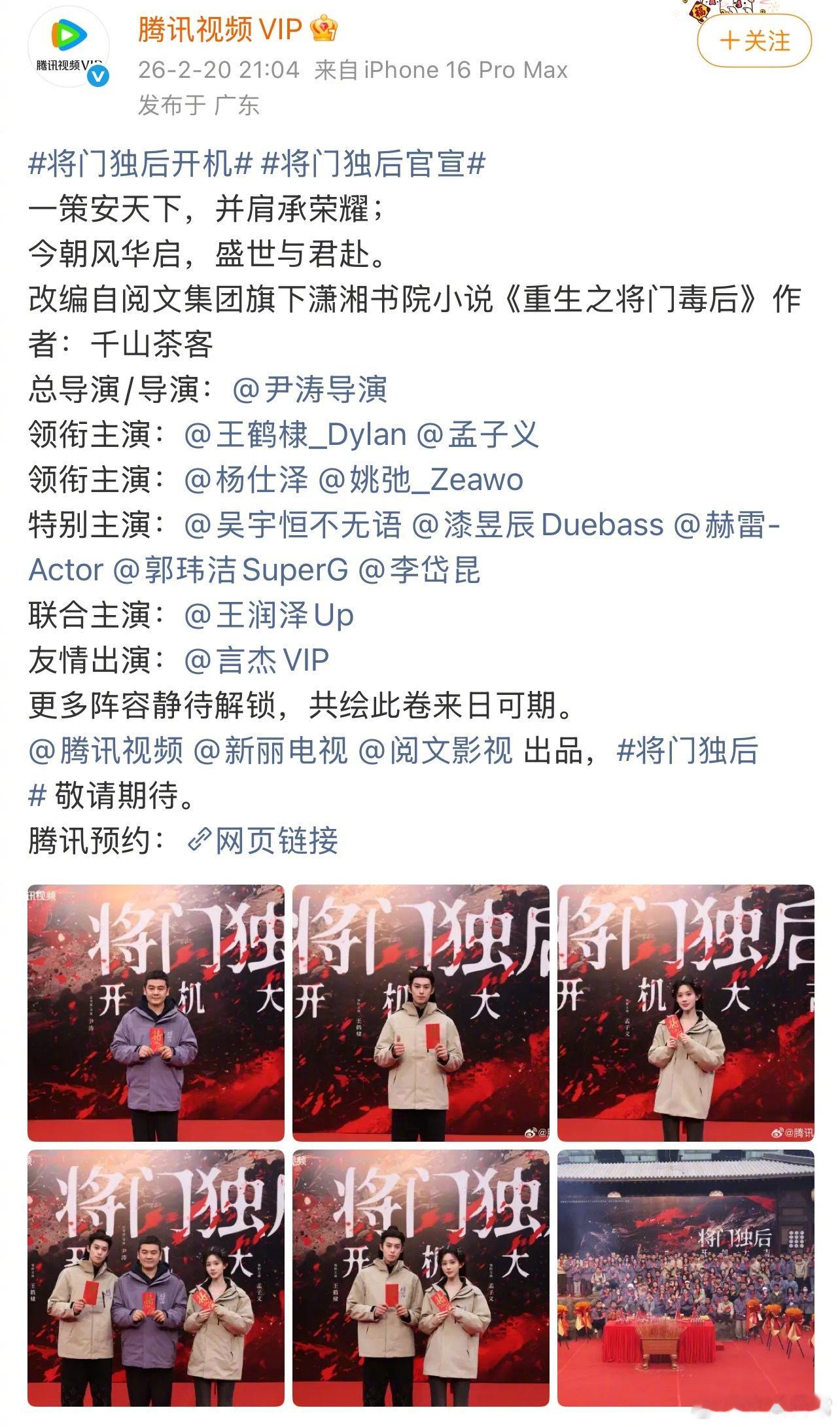 《将门独后》官宣全阵容领衔主演:王鹤棣 孟子义 领衔主演:杨仕泽 姚弛特别主演:吴宇恒 漆昱辰 赫雷 郭玮洁 李岱昆 联合主演:王润泽友情出演:言杰
