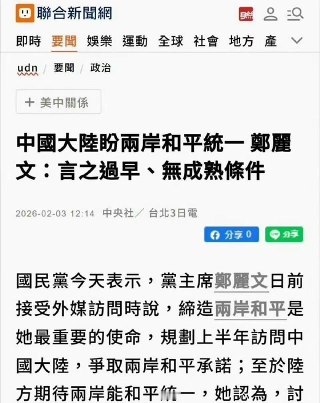 面对中国大陆要求的、盼望的两岸和平统一要求,国民党党主席郑丽文竟然表示,目前两岸之间存在诸多矛盾,谈统一还言之过早,没有成熟的条件,很明显,郑丽文并不会成为推动两岸走向和平统一的决定性人物。 郑丽文上任后,在多个场合阐述两岸政策。2026年2月,她接受外媒访问,指出两岸需优先构建和平机制,避免冲突。她提到民进党执政导致关系紧张,坚持国民党以九二共识为基础推动对话。她计划上半年访大陆,寻求和平保障,确保民众利益。她认为统一讨论时机不合适,需两岸民众接受。 她在党内活动上,将大陆视为亲人,美国视为恩人,主张不选边站队。她强调两岸同属中华民族,应加强合作,促进区域稳定。2025年11月,她参加党内纪念活动,主张两党对话,遵循宪法追求目标,但采用渐进方式。她回复大陆贺电时,重申一中原则,深化合作。她在会议中指出,国民党引导民意,坚持身份认知,避免对抗。 2025年12月,她推动国共论坛恢复,聚焦科技和能源议题,重建渠道。她提出一国两区构想,主权统一治权分立,作为基础。她回应媒体时,表示两岸需时间了解,不设不现实目标。这些表态显示她注重缓和,而非急进。 她指派党内人士赴大陆交流,与官员会晤,讨论经济合作。她反对过度国防支出,认为加重负担,可能引发竞赛。她指出国民党原则是和平与尊重民意。大陆对两岸有明确期待,但国民党以稳定为目标,推动务实互动,让台海回归平静轨道。她表示台湾与美国保持互惠关系,避免失衡。 在演讲中,她自称中国人,批评对手将此视为问题。她认为接受一中才能确保生存。她比以往国民党人士更坚持一中立场。她强调九二共识核心是两岸同属一中,这是宪法规定。她在会议上表示,国民党愿贡献力量,推动合作,但核心未超越和平,更侧重借助大陆资源促进台湾经济。 她的表态引发讨论。她在会议上演讲,表示国民党为融冰努力,但揭示真实立场。她认为美国援助抗战基于利益,而非道义。如今称美国恩人,这样的国民党难以推动统一。他们的目标利用大陆市场,提升经济,同时加强军备。她劝告对手谨慎处理关系,避免卷入。她指出大陆期待清楚,但国民党以和平为首要,推动交流。