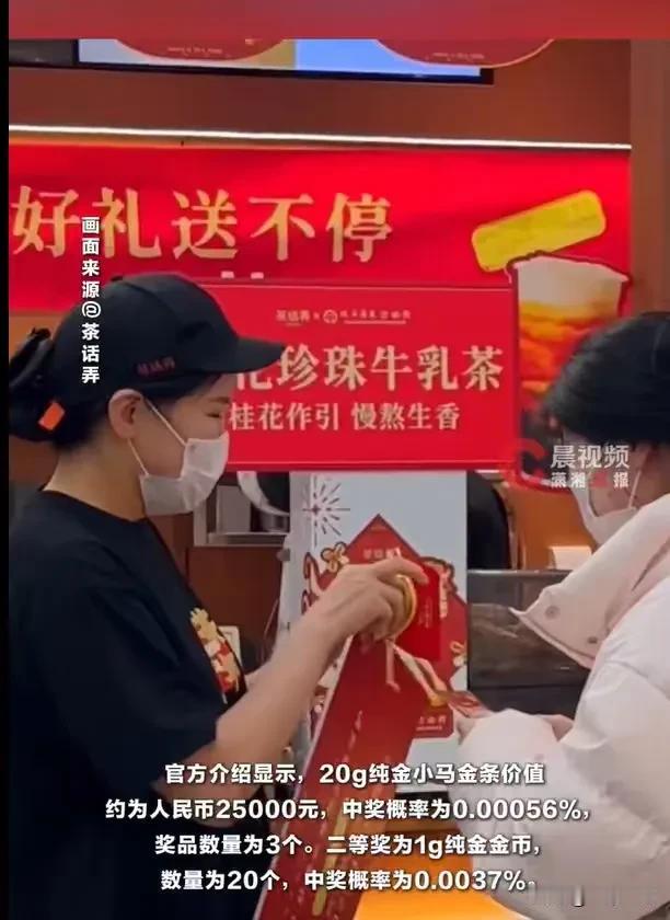 陕西西安,女子买了一杯20多元的奶茶,店里有活动,可以刮奖,女子不抱希望,结果一刮奖,刮出了一等奖,中了20克的黄金,中奖率是0.00056%,女子简直不敢相信,店员却说这是真的。 当一等奖这三个字,出现在女子的眼前,女子简直不敢相信,自己真的中了这么大的奖,她从来没有中过奖,这是她第1次中奖,她愣了好久,依然还在怀疑,这到底是不是真的。 女子去旅游,路过一家店,正好想喝杯奶茶,她就进店点了一杯,这杯奶茶也不算便宜,要20多元。 她本来就爱喝奶茶,20多块钱一杯饮品,既然是来旅游的,她就不怕花这个钱。 买了奶茶之后,她才知道店里有活动,可以刮奖,奖品还挺丰富的,100%都可以中,当时女子看着这个活动,一等奖的奖品居然是20克的黄金,她还以为这是假的,中奖应该也只是那些小奖品,20克的黄金只是做做样子而已,不会是真的。 反正是来玩的,反正也是买奶茶有活动的,她就顺手刮了奖,并没有期待中奖。 她从来就没有中过奖,所以对于这种活动,她根本不抱希望。 结果她随手一刮,一等奖三个字出现在她的眼前,那一刻她简直不敢相信,这个是真的。 她居然这么好运,能中一等奖,直到中奖这一刻,直到看到一等奖这一刻,她依然不敢相信。 可是这三个字就在她眼前,活动正在进行,她问了一下店员,店员也肯定地点了点头,她就是中奖了。 这是她人生中第1次中奖,还是中了20克黄金,价值大概25,000元。 直到她确认中了小马黄金的那一刻,她依然是恍惚的,她这才敢相信,她真的是中奖了。 能拿到这个小马黄金,女子觉得这不单单是一块黄金那么简单,这是象征着她的好运,她打算拿到小马黄金后,不卖掉换钱,她就想收藏着,将这个运气伴随她一生。 这么好的运气,女子不想卖掉小马黄金,这是大家都能够理解的。 毕竟有钱了可以买黄金,但是并不一定有这么好的运气,能够买一杯奶茶就中20克的黄金,这个概率实在是太低了。 据店员所说,他们的这个活动,中奖率是百分百,但是一等奖的20克小马金条,中奖率是0.00056%,奖品只有三个,二等奖是一克的黄金,一共有20个,中奖率只有0.0037%。 如此低的概率,居然被女子中了一个,实在是太难得了,这个运气实在是太好了,这样好的运气,不把黄金保留着,实在是可惜,她要收藏黄金,实际上就是要让好运气伴随自己的一生。 女子中了奖之后,当时也是激动得蹦跳起来,她几乎要流泪了,这次中奖,是她在这次旅行当中,最大的收获,也是她最激动最兴奋的时刻。 如此激动的时刻,一生难得,真是好运来了,挡都挡不住。 既然这个活动是真的,女子就不怕拿不到这个小马黄金,因为他们办了这个活动,就得信守承诺,说好给的奖品就要给。 《反不正当竞争法》第10条第1项规定:商家有奖销售的兑奖条件必须明确且不得影响兑奖。 正因为有此规定,如果店家不兑奖,那么他就是违法的,将会受到处罚。 《反不正当竞争法》第22条规定:如果商家违反了上述规定(包括不兑奖),就适用这一条进行处罚:由监督检查部门责令停止违法行为,处五万元以上五十万元以下的罚款。 不过店员已经说过这是属实的,他们报备总部之后,就可以回复了。 所以女子不会空欢喜一场,她确实能拿到实实在在的小马金条。 那么你对这样的活动有何想法呢?