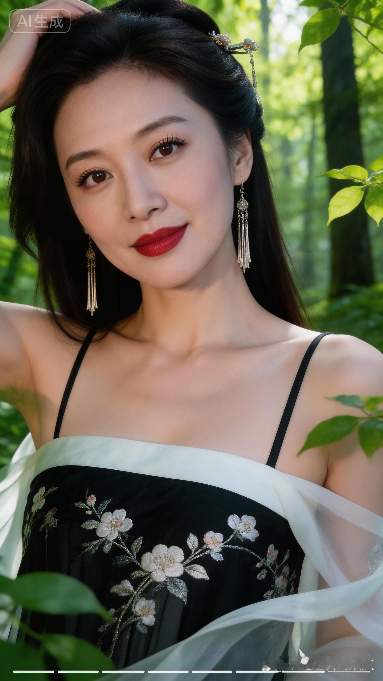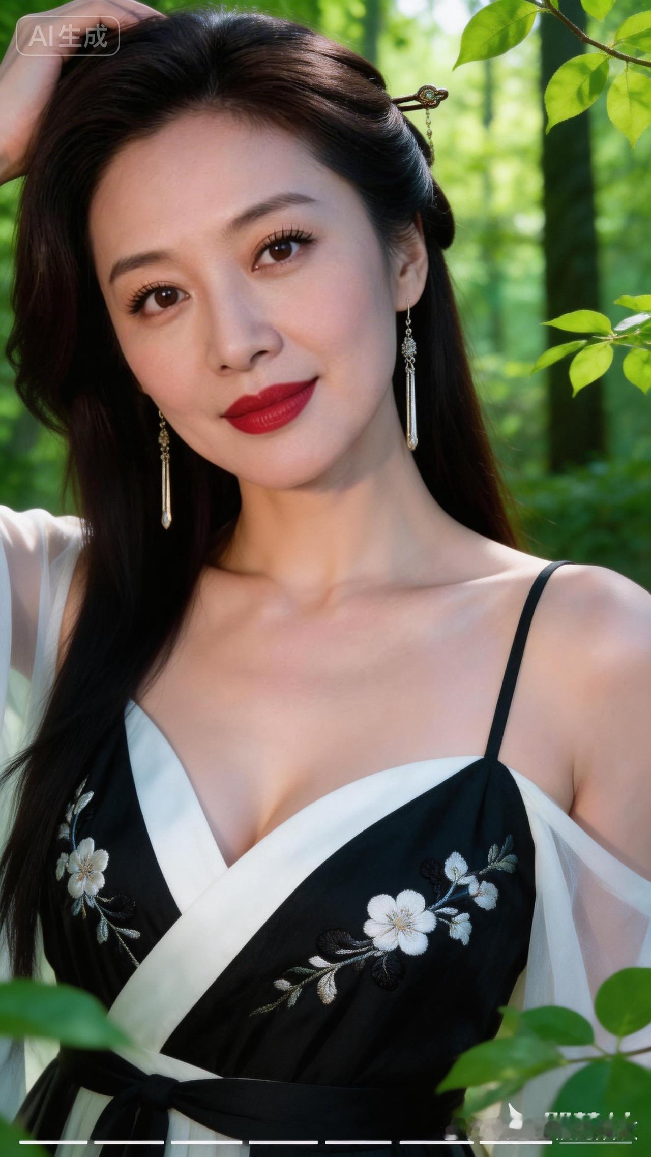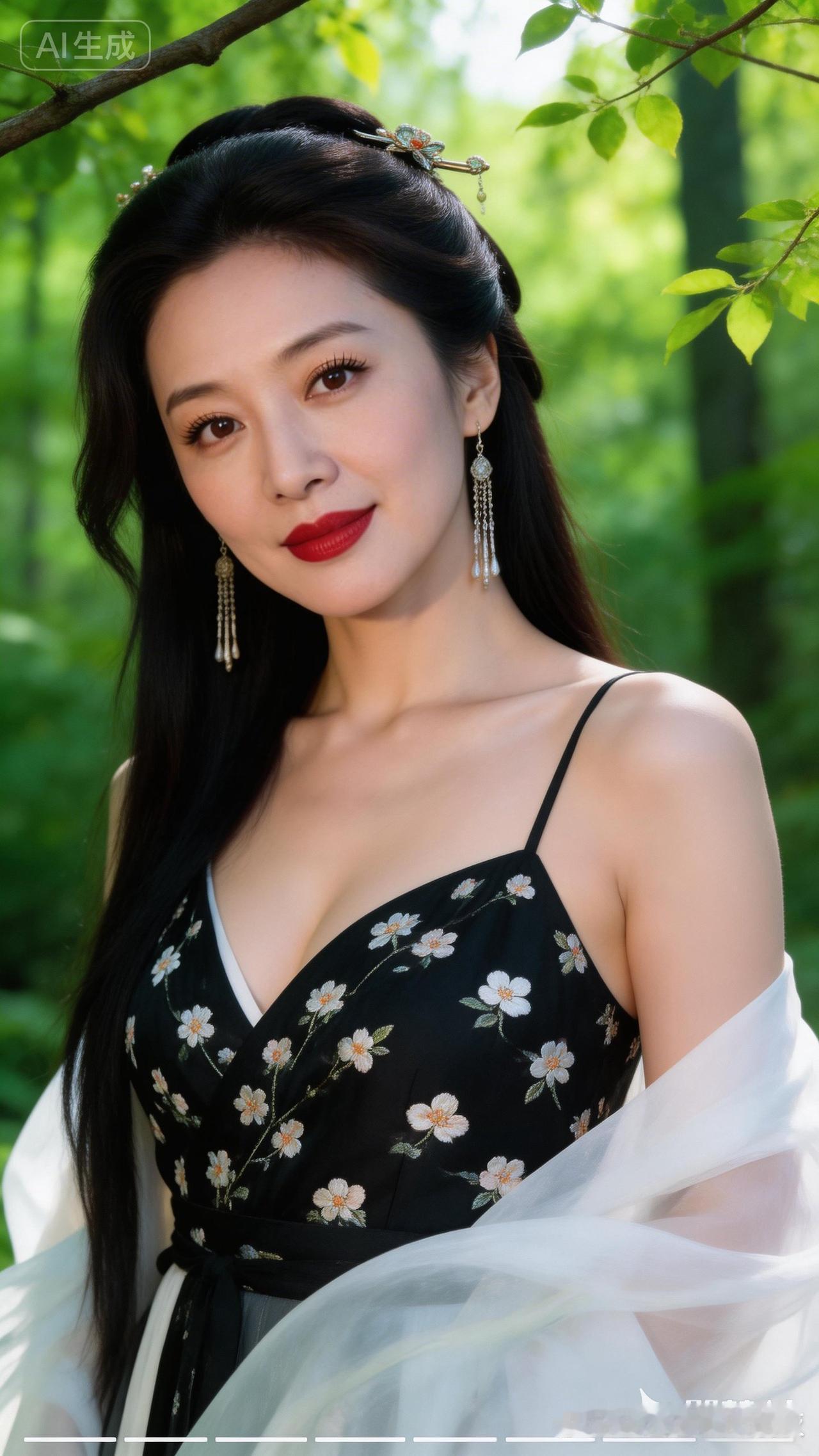 森林中的优雅女神,黑白色调的花朵连衣裙,自然光下的美丽瞬间。
