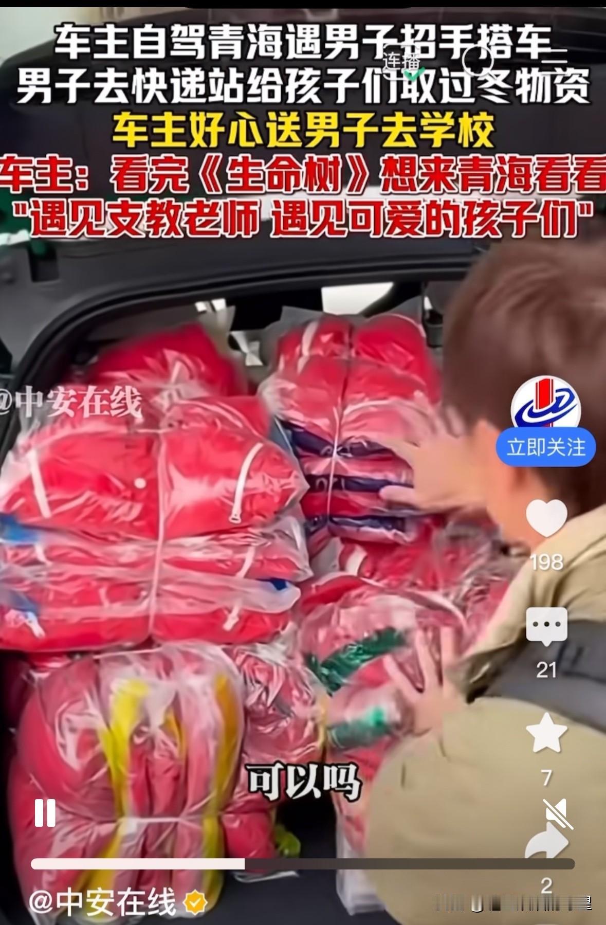 温暖的相遇!一男子独自一人在零下十七度的青海高原上行走,遇到一辆汽车时,朝汽车招手,想搭个车去取快递,车主了解到男子是支教老师,去取给孩子们御寒的物资,遂和老师一起取好快递并一路相送老师到偏远的学校。 近日,一车主自驾青海,在行驶途中,看见一个陌生的男子在寒风中行走,看到车子后,男子用力向他挥手。 车主于是放缓车速,开到男子身边停下汽车,但还是很警惕地没有打开门窗,而是隔着玻璃问男子有什么事。 见状,拦车的男子马上从身上拿出自己的身份证,第一时间递了上去,并笑着说:“你先看看,我不是坏人,我是这里的支教老师,就是想搭个车去快递站。” 车主放下心来,载着老师到了快递站。可当他绕了一圈回来,却发现老师还守在一堆包裹前,并没有离开。 他上前询问,才知道这些沉甸甸的包裹,全是给山里孩子们募捐的过冬羽绒服和物资。他正在想办法把这些物资运回去,老师说,冬天来了,孩子们的衣裳太薄,他盼着这些衣服能早点送到。 车主听到后没有丝毫犹豫:“那我送你回学校吧,把东西给孩子们分发下去。”老师愣了一下,随即笑着问道:“真的吗”,听到车主肯定的答复,老师的脸上瞬间绽开了花儿一样的笑容。老师马上礼貌地说:“那谢谢你,这段路我来开,你歇一歇。”两人一起把包裹搬上车,后备箱塞得满满当当,那些火红色的物资带来了整个冬天的暖意。 一路上,车主和老师聊着天,车主说他是因为看了《生命树》,才自驾来青海的。老师说自己老家在西安,在上大学的时候就有愿望,毕业的时候到边疆支教。现在他在这里几年了,他早已把学校当成了家,把孩子们当成了自己的亲人。 聊着聊着,时间彷佛过得很快,快到他们学校的时候,路边有孩子认出了老师,隔着老远就挥手喊“老师好”,原来,孩子们一早就知道老师去取快递了,一直在学校边等着。 到了学校,车主跟着老师一起分发物资。他帮孩子们脱下的单薄的旧衣,又亲手给他们换上崭新的红色羽绒服时,他的心里又酸又暖。 孩子们围着他和老师,用最灿烂的笑容表达着感谢,还在他的车上,用藏族特有的语言写下了祝福的话语。那些歪歪扭扭的字迹,是这片土地最纯粹的祝福! 车主说,他只是跟着《生命树》里的好人,做了一件力所能及的小事。可在孩子们眼里,这辆车、这位车主,还有那位扎根高原的老师,就是寒冬里最暖的光。 取材网络,侵删,个人观点,仅供参考。