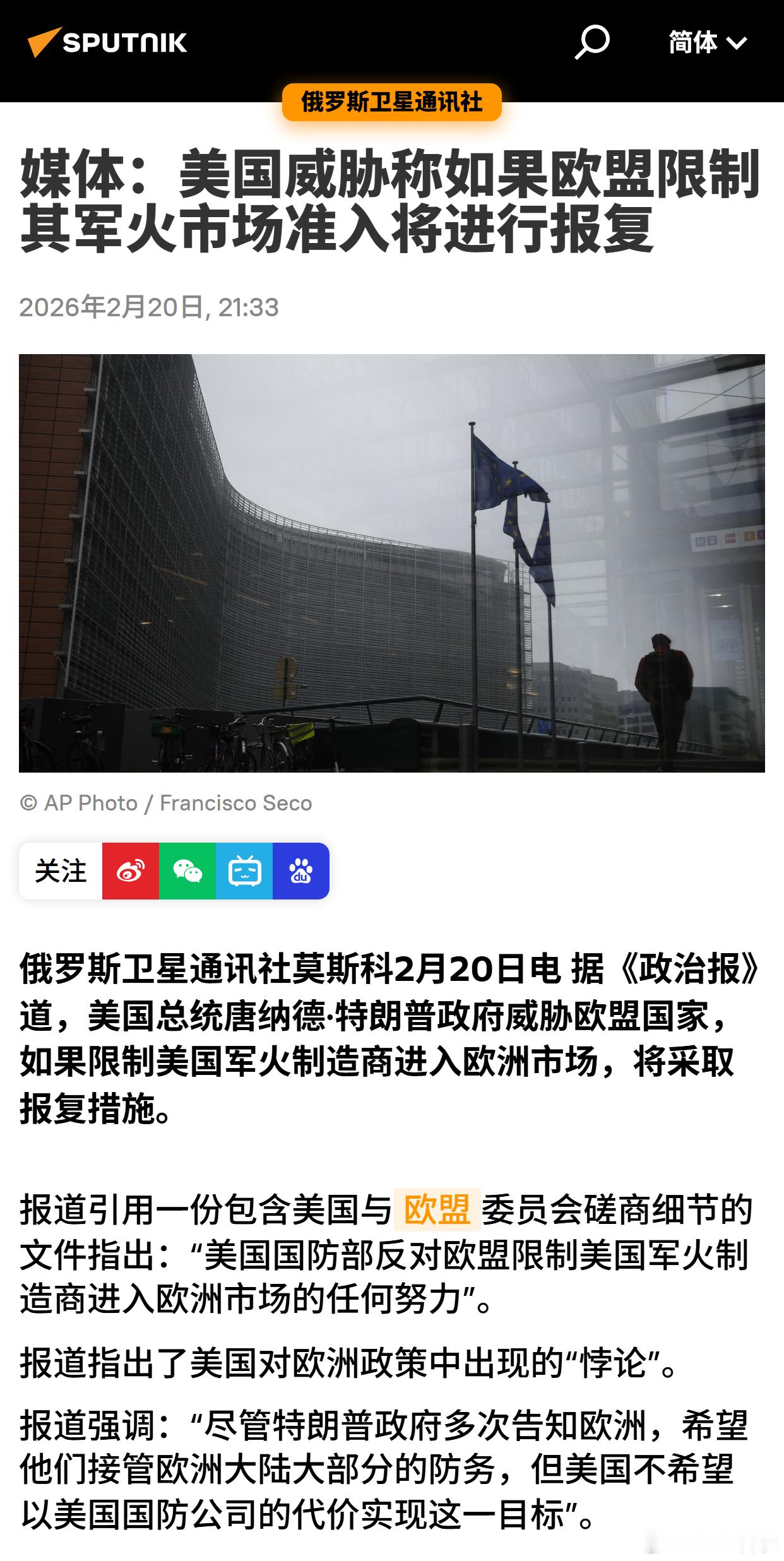 美国威胁称如果欧盟限制其军火市场准入将进行报复