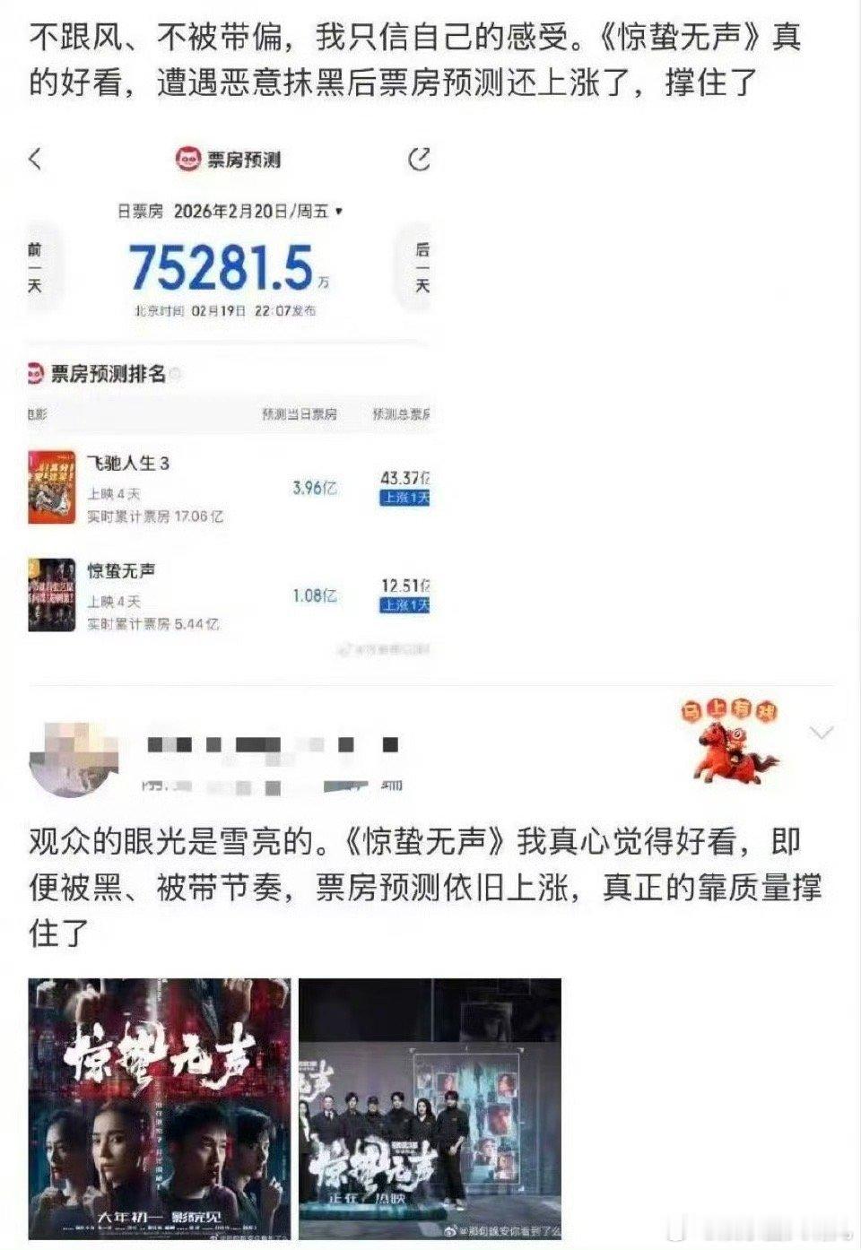 惊蛰无声撑住了 从路演现场到网络评论区,看到的都是观众发自肺腑的喜欢。那些硬压的黑评反而显得可笑。质量撑起来的片子,不怕风吹雨打,这次是真的撑住了。