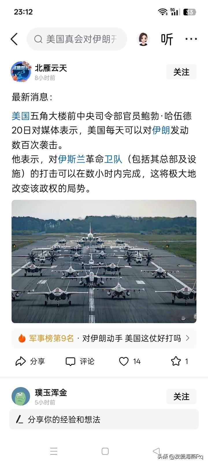 很霸气? 美国对伊朗是否进行军事打击,目前并不知道。但美国这几天加紧向伊朗附近调集武器装备,却是不争的事实。 美军的一个前军官表示,美军每天可以对伊朗进行几百次的打击。然而,对伊朗革命卫队的主要目标的打击,则仅仅需要几个小时就可以完成打击任务。但不清楚对革命卫队打击的目标中,是否包括传闻中的2000枚弹道导弹发射装置,以及弹道导弹的仓库和存放点。因为这至关重要,一旦弹道导弹被摧毁,也就差不多了。