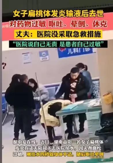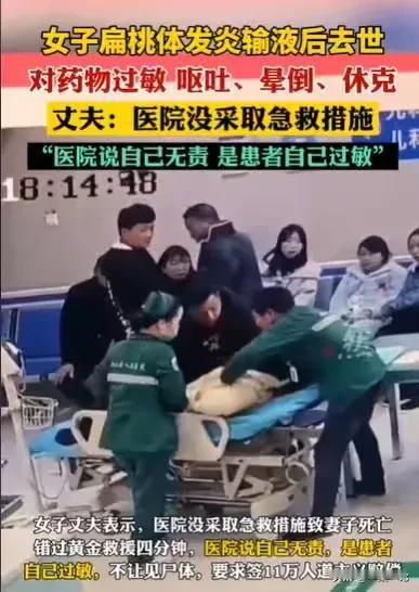 湖南益阳,女子扁桃体发炎,护士给她输头孢曲松,结果挂水4秒,女子就出现了胸很闷,又吐的症状,后来直接就晕倒了,护士和护工并没有及时采取急救措施,女子最终离世,但医院认为自己无责,说是患者自己过敏导致的,他们不让看尸体,要求女子丈夫签11万的人道主义赔偿。 只见视频里,女子还没有挂水之前,一切都看起来还挺正常的,还和丈夫说话,还看着护士给她扎针输液,人也挺精神的。 护士给她扎了针,输液之后,护士就离开了,可短短4秒钟,女子就感受到胸很闷,她赶紧将外套拉开拉链,接着又感觉到头晕了,她手托着额头。 丈夫一看妻子不对劲,就知道输液有问题,就赶紧叫来护士,护士过来之后,就把输液的针给拔了。 可即使这样,女子依然感到非常不舒服,她很快吐了起来,那时候有一个护士过来看了一眼,还没有意识到问题的严重,她走开了。 女子吐了之后,一个护工也走过来了,也没有意识到问题的严重,他也走开了。 女子越来越痛苦了,丈夫能够感受到妻子的难受,看到有护士经过,就大喊让护士来帮忙。 一个护工推着仪器过来,护士和护工也拿来的担架,可这个时候已经过去了近4分钟,他们才将女子抬上了担架。 就这短短几分钟,丈夫亲眼看到,自己的妻子从挺精神的状态,进入了休克的阶段。 他亲眼看见自己的妻子,自从输了液之后,整个人非常痛苦的状态,却看到护士和医生,始终没有在这关键的4分钟里,采取急救措施,导致他的妻子离世了。 他真的难以接受这个结果,他的妻子只是扁桃体发炎而已,这个是小病,完全是可以治好的,就因为来医院输了液,短短几分钟时间,他妻子的命就这样没有了,他真的难以置信。 回想起妻子输液之前,护士给他的妻子输液,护士并没有问他的妻子什么药物过敏,护士给妻子输的头孢曲松,也没有皮试。 如果护士在开始输液前,给他的妻子做皮试,他的妻子肯定能够躲过这一劫。 正因为没有皮试,他的妻子药物过敏了,发生这种情况之后,护士在关键的那几分钟里,没有意识到这个问题的严重,连护工也没有意识到这个问题有多严重,反正他们在那黄金4分钟里,没有采取措施。 直到女子非常难受,直接晕倒,他们才意识到这个问题的严重。 可是由于那几分钟,他们没有引起重视,女子也因此失去了生命。 事情已经发生了,女子的丈夫亲眼看到了这个过程,他认为发生这样的事情,是医院的问题。 作为一名护士,应该能够判断的出来,他妻子当时的情况应该是过敏,就应当通知医生,采取相应的急救措施。 可因为那几分钟,护士和医生以及护工都没有引起重视,直到问题严重了,他们才对他的妻子进行抢救,可一切都为时已晚了,女子还是离世了。 发生这样的事情,对于女子的丈夫来说,打击真的很大。 可能在他和妻子看来,扁桃体发炎不过是一个小病,输点液,消一下炎就好了,可是就是这么一个小病,导致女子失去生命,这真的让人难以置信。 发生这样的事情,女子的丈夫当然要追究医院的责任,毕竟他是亲眼看到妻子悲剧的发生,就是由于医院没有及时采取急救措施导致的。 如果当时,护士能够意识到,问题很严重,马上采取急救措施,事情就不会是这个结果。 但医院却认为自己无责,他们认为这是患者自己过敏导致的,这个说辞让女子的丈夫难以接受。 他觉得医生和护士作为医护人员,在使用这个药物之前,应该问一下患者,如果患者不确定,就应该做皮试,可他们没有做皮试,直接给女子输液,女子的丈夫觉得这个过程有问题的。 现在悲剧发生了,他只想医院给一个合理的解释,医院却只是推卸责任,说自己无责,问题出现在女子自己本身过敏,才导致悲剧的发生,这真的让人难以接受。 更让女子丈夫难以接受的是,医院为了推卸责任,要求他签11万的人道主义赔偿,了结此事,发生这样的事,他怎么可以拿11万? 他的妻子失去生命,医院怎么可以用这11万,来衡量他妻子的生命? 现在因为他们的失误,他和妻子阴阳两隔,他真的是难以承受这个结果。 发生这样的事情,如果医院确实存在失误,那么医院是需要承担责任的。 至于这件事,医院到底有没有责任,则要看当时,他们使用这个药之前,有没有尽到相应的责任。 《民法典》第1221条规定:医务人员在诊疗活动中未尽到与当时的医疗水平相应的诊疗义务,造成患者损害的,医疗机构应当承担赔偿责任。 在药物过敏之后,他们是否有没有及时处理,如果他们没有按照一定的流程处理,确实因为抢救不及时,导致女子失去生命,那么他们应当承担过错责任。 那么发生这样的事情,你认为医院有责任吗?