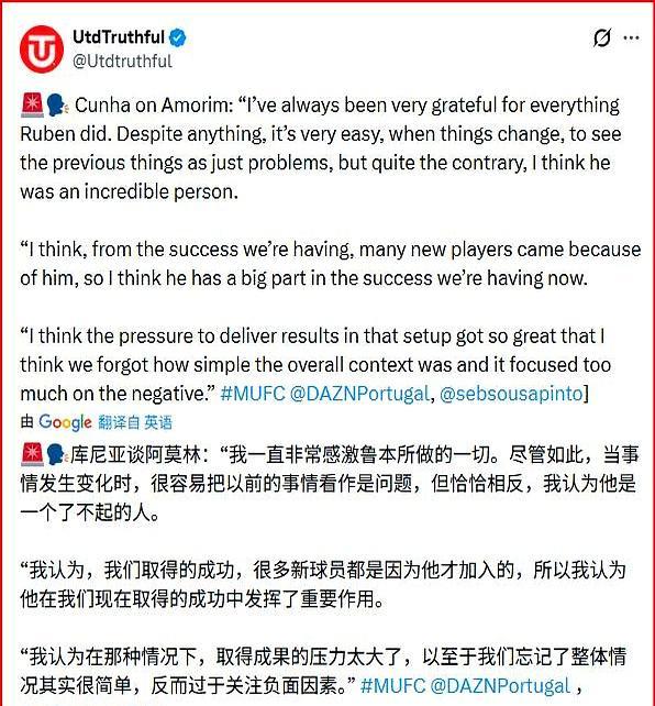 球队换了教练就连赢,球员反倒出来感谢被炒掉的那个。 前段时间,曼联把教练阿莫林给解雇了。新上来的卡里克带队,五场不败,还赢了好几个强队,一下冲到联赛第四。 结果前锋库尼亚出来说,这么想就偏了。他说现在队里不少人都是阿莫林当时力主买来的,现在能踢出来,不能忘了人家的功劳。 他觉得之前成绩不好,是整个更衣室都太紧张了,怕输怕被骂,背着包袱踢球,结果越踢越差。 有时候这事儿就这么怪,栽树的人走了,吃果子的是后来的。