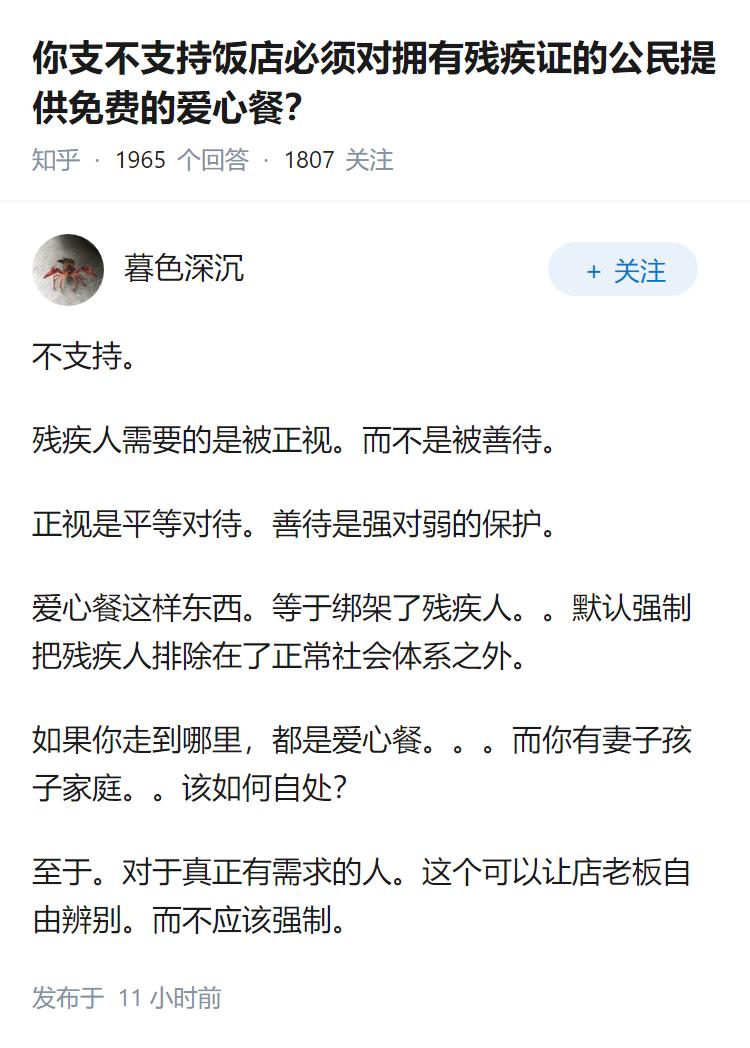 你支不支持饭店必须对拥有残疾证的公民提供免费的爱心餐?