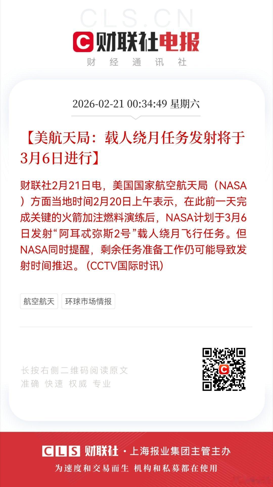 【美航天局:载人绕月任务发射将于3月6日进行】财联社2月21日电,美国国家航空航天局(NASA)方面当地时间2月20日上午表示,在此前一天完成关键的火箭加注燃料演练后,NASA计划于3月6日发射“阿耳忒弥斯2号”载人绕月飞行任务。但NASA同时提醒,剩余任务准备工作仍可能导致发射时间推迟。 (CCTV国际时讯)