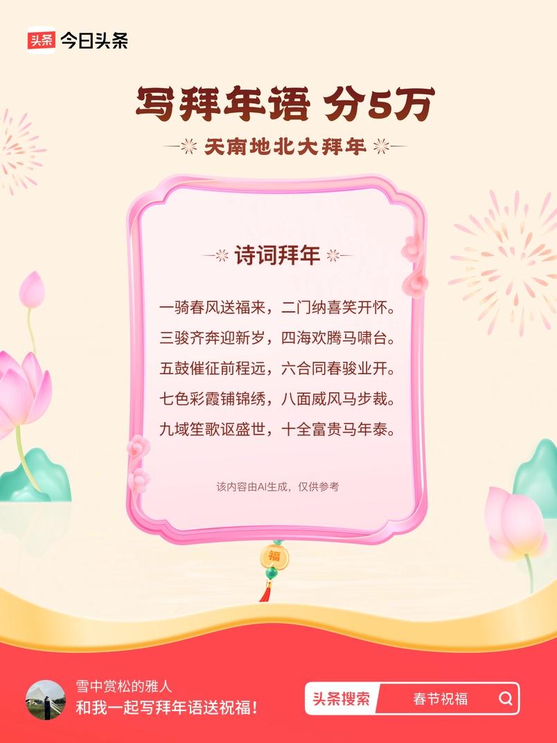写拜年语送祝福新春拜年送祝福!我的祝福是:“一骑春风送福来,二门纳喜笑开怀。三骏齐奔迎新岁,四海欢腾马啸台。五鼓催征前程远,六合同春骏业开。七色彩霞铺锦绣,八面威风马步裁。九域笙歌讴盛世,十全富贵马年泰。”!快来一起写祝福吧戳这里,一起领红包>