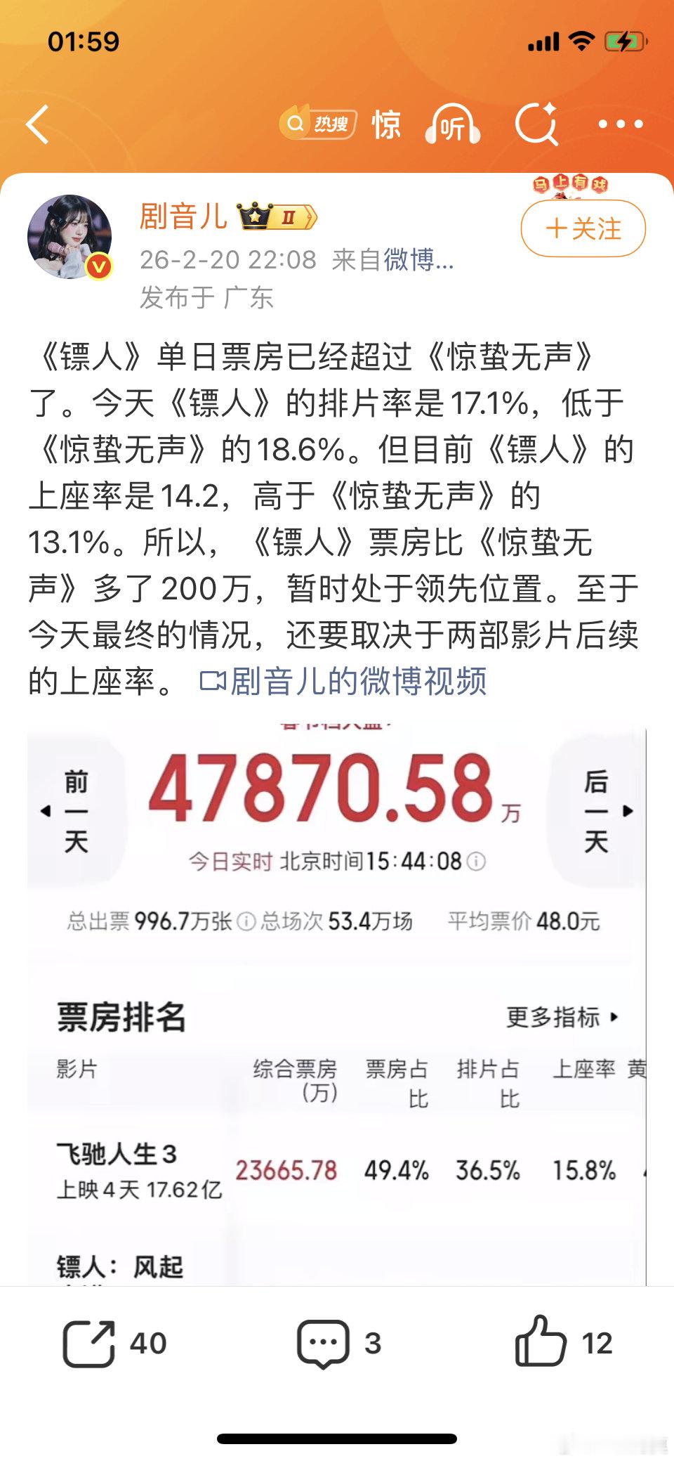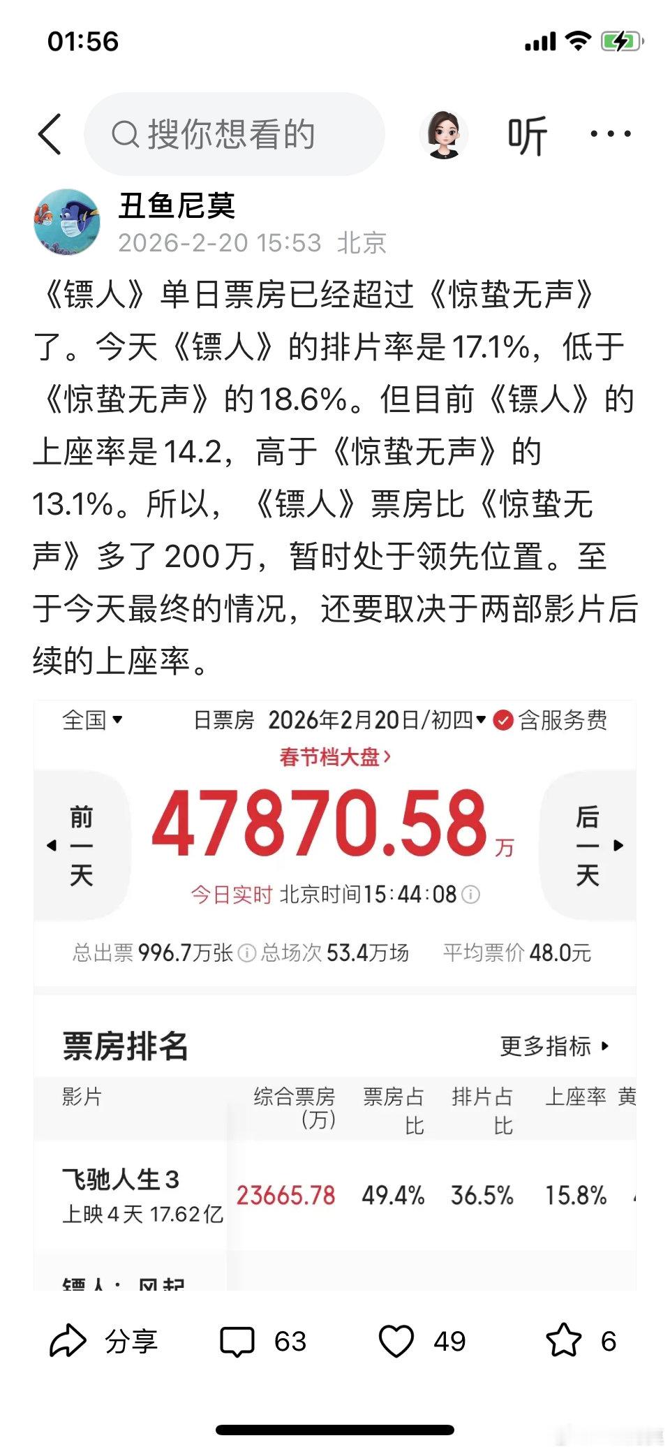 《镖人》票房已经超过了《熊出没》,即将反超《惊蛰无声》(《镖人》排片率仍低于《惊