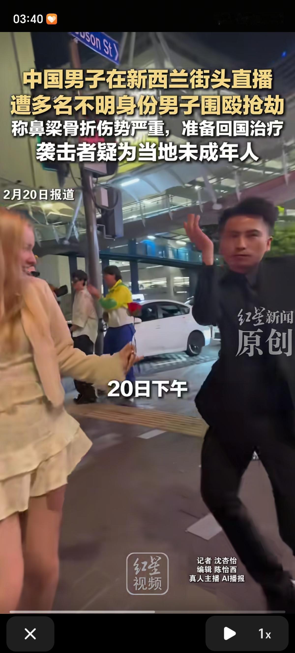 中国男子在新西兰街头直播遭遇多名不明身份男子围殴抢劫,称自己鼻梁骨骨折伤势严重,准备回国治疗。因为预约需要很长时间,他需要及时手术。 网红“神不在新西兰”在新西兰奥克兰市中心街头直播跳舞,十余名当地青少年佯装与他跳舞互动,随后突然抢走他的两部直播手机和随身背包。他与朋友追赶时,被对方引入死角并遭到围殴。 受害者被诊断为鼻骨骨折,浑身多处受伤,需要手术治疗。 警方约10分钟后赶到现场,将其送医。由于当地公立医疗等待时间长,他已改签机票,准备提前回国接受治疗。 袭击者疑似为当地未成年人,根据新西兰法律,即便被抓获,也可能不会受到严厉处罚。 中国驻奥克兰总领馆高度关注此案,已第一时间向奥克兰警方表达严正关切,要求尽快依法、公正、严肃调查处理,切实保障中国公民的正当合法权益。