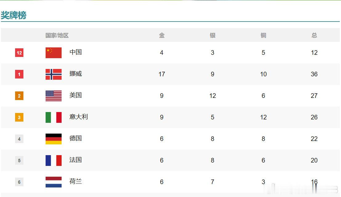 米兰冬奥3天摘4金! 中国代表团来到奖牌榜第12位------北京时间2月20日消息,在今天进行的米兰冬奥会自由式滑雪男子空中技巧决赛中,中国选手王心迪以132.60夺冠,摘得中国代表团第四金,李天马获得铜牌。相隔一天的时间,“桃心夫妇”帮助中国队包揽了自由式滑雪男女空中技巧金牌,在王心迪完成完美一跳后,徐梦桃跑来送给了爱人一个大大的拥抱!中国代表团也在3天的时间内连摘4枚金牌,以4金3银5铜来到了奖牌榜的第12位。 网页链接