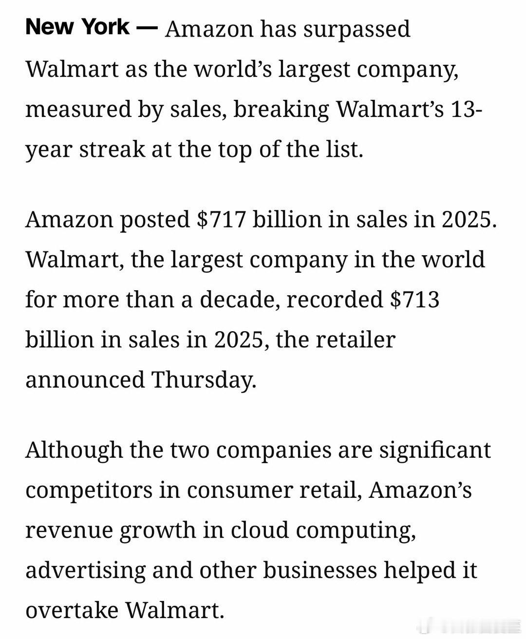 Amazon 2025全年销售额$7170亿,超过Walmart同期的$7130亿,成为全球销售额最高的企业(之前连续十三年是Walmart)🥇