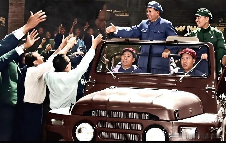 1967年五一节,毛主席站在吉普车上和革命群众亲切握手。