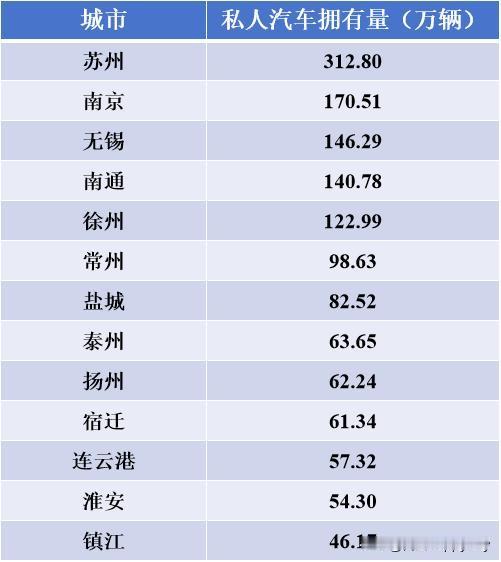汽车 江苏 老徐不穷,依旧是苏北王。江苏各市私人汽车拥有量,苏州每4人就拥有1辆私家车,为江苏最多。每8个淮安人拥有1辆,在省内最少。 老徐人均私人汽车拥有量在省内排名第8,于苏北五市中位居头名。私家车拥有总量在全省排第5,在苏北依旧排第一,其后依次是盐城、宿迁、连云港、淮安。淮安总量倒数第二,人均倒数第一,难道是淮安人不喜欢买汽车? 盐城 宿迁 淮安 汽车保有量