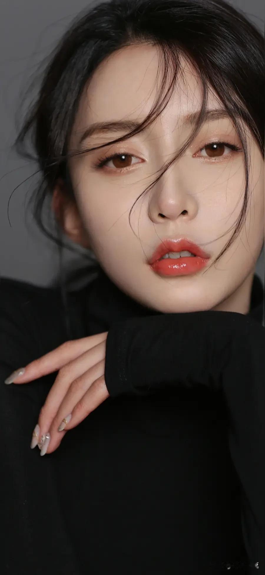 冷艳黑衣少女,红唇与黑发相映成趣,优雅而神秘。