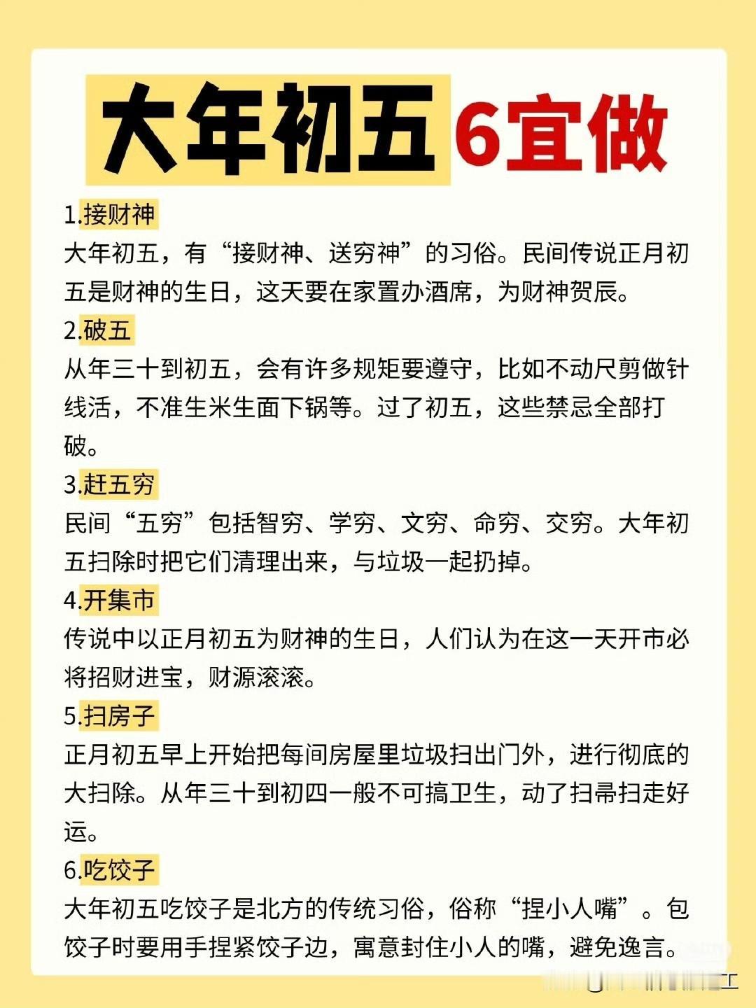 大年初五,破五,送穷! 可以扫地,洗衣服,丢垃圾了 最重要的,接财神!大年初五接财神,都去给我接!