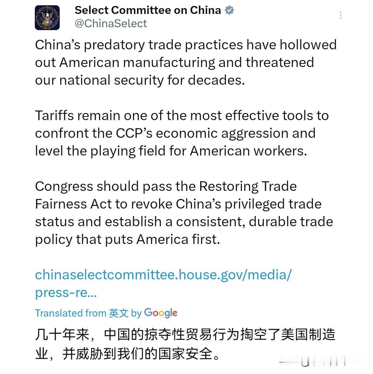 美国非常不满!2月21日,美国众议院中国问题委员会声称,几十年来,中国“掠夺性”的贸易行为掏空了美国制造业,威胁着我们的国家安全。关税仍然是对抗中国“经济侵略”和为美国工人创造公平竞争环境的最有效工具之一。美国国会应该通过《恢复贸易公平法案》,撤销中国的“贸易特权”地位,并制定一项始终如一、持久的、以美国为优先的贸易政策。 很显然,面对中国制造业竞争能力越来越强,美国对华鹰派对此感到非常的愤怒。这些对华鹰派声称中国是“掠夺性”的贸易行为,是“经济侵略”,那请问这具体指的是什么呢?难道中国强迫美国购买中国的产品了吗?中美进行贸易往来,本质上不就是双方企业、市场、消费者共同选择的结果吗?这何来掠夺? 美国制造业空心化,根源在自身产业政策、资本逐利、全球化分工,是美国企业为了追求更低成本、更高利润,主动把生产线外迁。现在美国自己内部出问题了,美国一点都不从自己身上找原因,而是把所有的问题推到我们身上,这样的甩锅行为,我们当然不会接受。中国享有的权力,并不是特权,而是WTO框架下的正当权力。如果美国再次挑起贸易争端,那我们必然也会对美国进行反制。