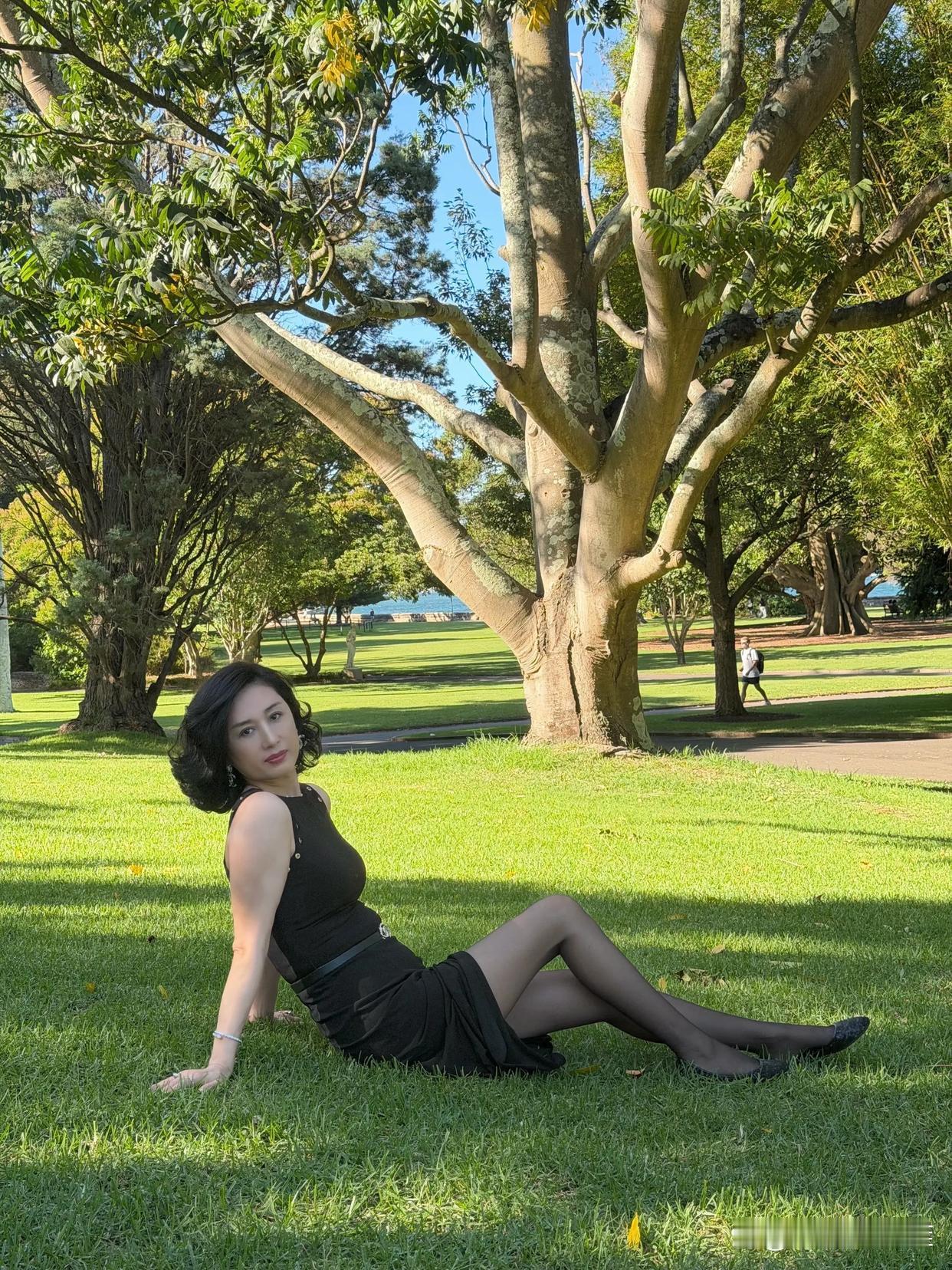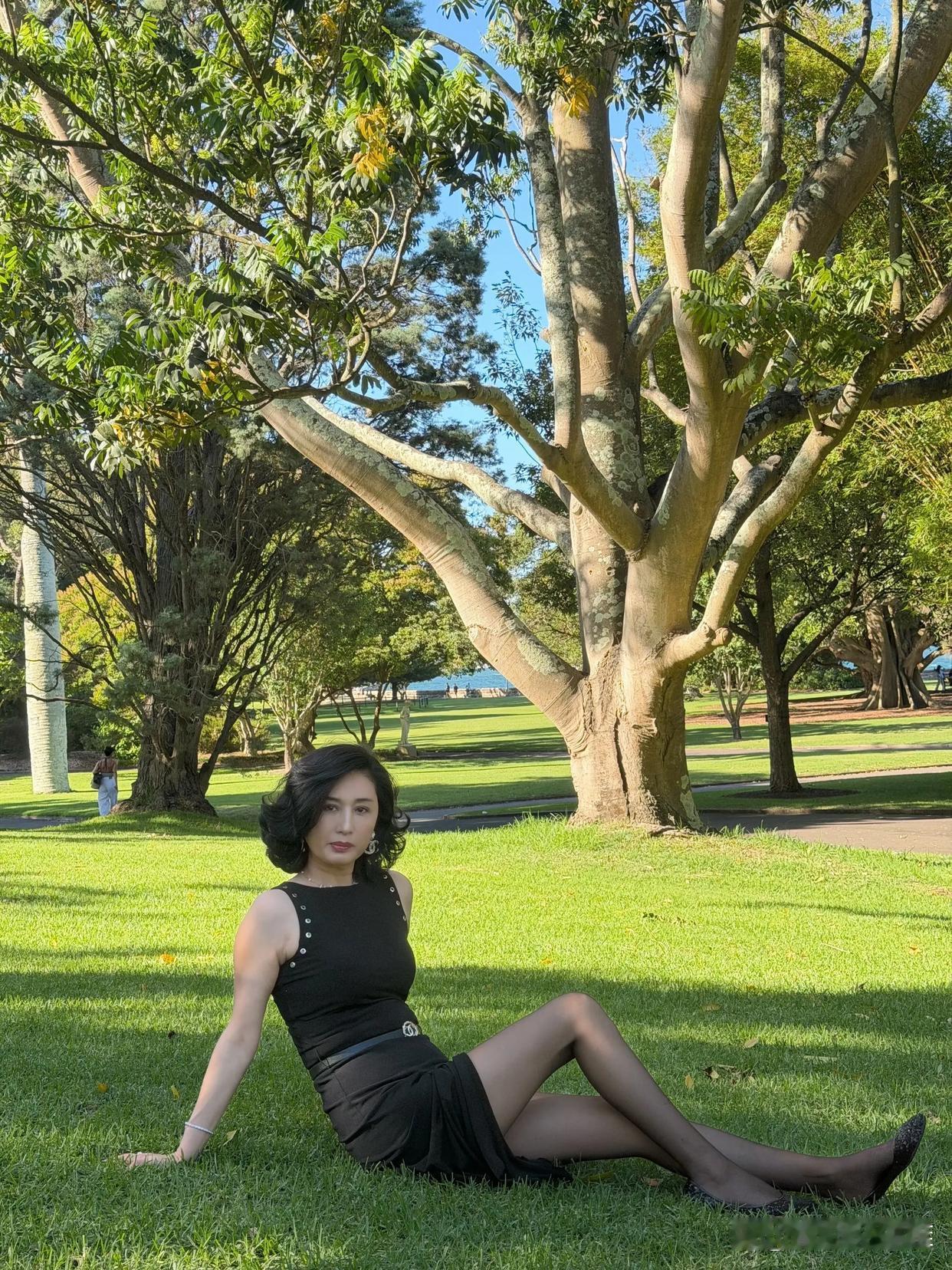 随手拍记录美好的点滴公园长椅上,白色长袖贴着肩,深灰半裙垂下来,浅粉高跟鞋踩在草