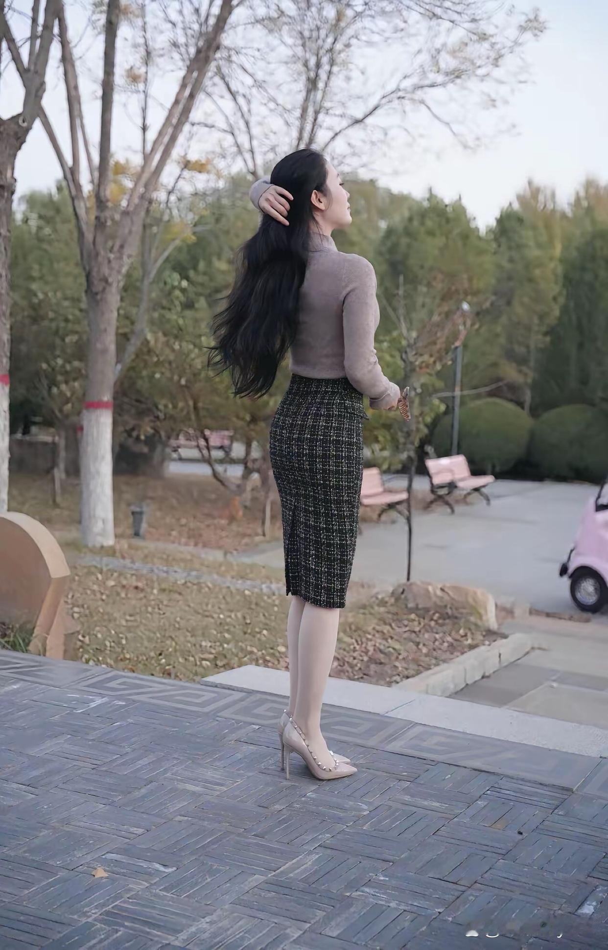 随手拍记录美好的点滴公园长椅上,白色长袖贴着肩,深灰半裙垂下来,浅粉高跟鞋踩在草