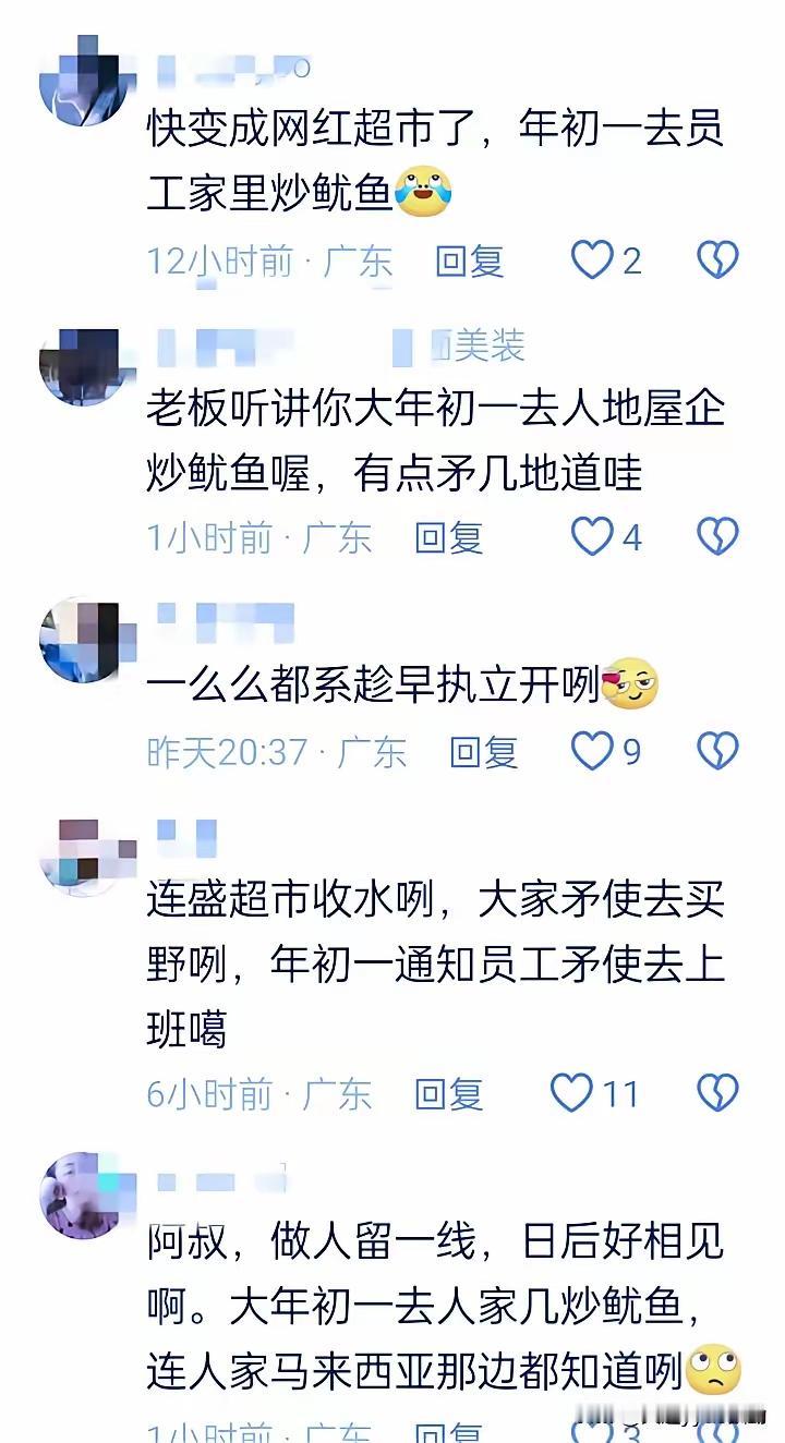 广东茂名一名超市员工年初一被老板"炒鱿鱼" 超市老板大年初一到员工家里炒员工“鱿鱼",太离谱了,就不能多等几天,让员工安心过年,很多人都无法接受。 大年初一是阖家团圆、祈求新年顺遂的日子,在茂名当地,这一天家家户户都要走亲访友、祭拜祈福,没人愿意在这天听到糟心的消息,更没人能接受上门辞退这样的做法。这名员工此前还拒绝了其他工作机会,专门接受这位超市老板的邀请入职,年前超市客流大、工作繁重,员工全程认真在岗,没有出现任何工作失误。忙完最辛苦的时段,本想趁着春节好好休息,和家人过个安稳年,没想到老板会选在正月初一上门,直接告知不用再来上班。 员工面对这突如其来的辞退通知,当场陷入委屈与愤怒。她没有提前收到任何口头或书面的提醒,没有接到过关于工作表现的整改意见,更没有参与过任何关于解除劳动关系的协商。老板没有给出合理的辞退理由,只是单方面宣布结果,全程没有顾及员工的感受,也没有考虑春节这个特殊的时间节点。员工原本计划用春节假期调整状态,年后安心工作,这份突然的失业通知,直接打乱了她全年的生活与工作安排。 当地街坊得知这件事,大多表示难以理解。茂名本地重视人情与分寸,即便有矛盾要处理,也不会挑正月初一上门说事,这是最基本的处世底线。做生意讲究和气生财,善待员工是经营的基础,老板在法定节假日、全民欢庆的时刻上门辞退,既违背公序良俗,也触碰了职场伦理的底线。员工靠劳动换取报酬,为超市付出了时间与精力,即便要解除合作,也应该选择合适的时间,遵循基本的尊重。 从劳动法规来看,用人单位单方解除劳动关系,必须符合法定情形,还要履行提前告知、说明理由、出具书面证明等程序。老板仅以口头方式,在员工家中、在春节当天完成辞退流程,不符合劳动合同法的相关规定。员工若存在严重违反规章制度、失职造成重大损失等情况,老板可以依法辞退,但目前没有信息显示员工有这类行为。无正当理由、无正规程序的辞退,属于违法解除劳动关系,员工有权向当地劳动监察部门投诉,申请相应的经济赔偿。 视频在网络传播后,迅速引发大量网友共鸣。不少打工人分享自己春节前后被不合理辞退的经历,大家普遍认为,辞退员工可以理解,但要守时间、守规矩、守底线。年前用人、年后踢人,是最消耗员工信任的做法。超市属于服务行业,员工的态度直接影响顾客体验,老板对员工缺乏基本尊重,长远来看也会影响店铺的口碑与经营。 打工人在外谋生,求的是稳定收入与基本尊重。春节是一年中最有仪式感的节日,是疲惫生活里的喘息机会。推迟几天告知辞退结果,不会影响老板的经营决策,却能让员工过个安稳年。这份举手之劳的善意,被完全忽略。成年人的生活本就充满压力,一份工作承载着房租、伙食、家庭开支等现实需求,突然失业带来的焦虑,远超过事情本身。 尊重劳动者,不是一句口号,而是体现在每一个细节里。合法用工、体面解约,是企业必须遵守的准则,也是做人的基本良知。生意可以有盈亏,做人不能丢底线。善待员工,就是善待自己的事业,守住人情温度,才能走得更稳更远。 各位读者你们怎么看?欢迎在评论区讨论。