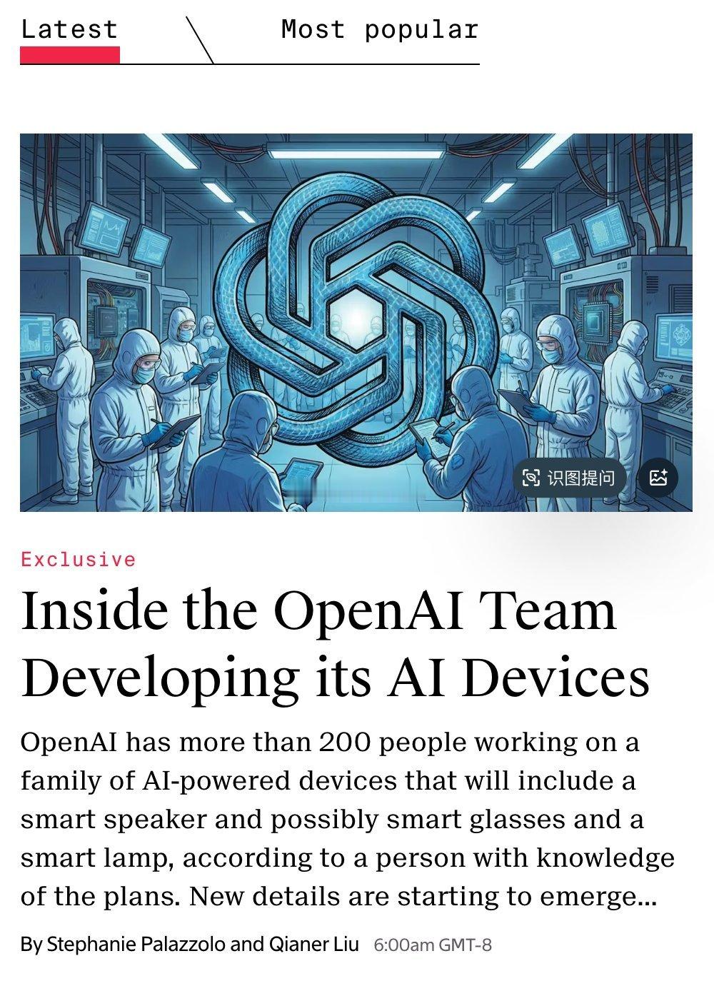 OpenAI的200人团队正在开发一系列AI设备,包括一款配备摄像头的智能音箱,定价约为200至300美元,最早在2027年2月上市。除此之外,OpenAI还可能会推出智能眼镜与智能灯。