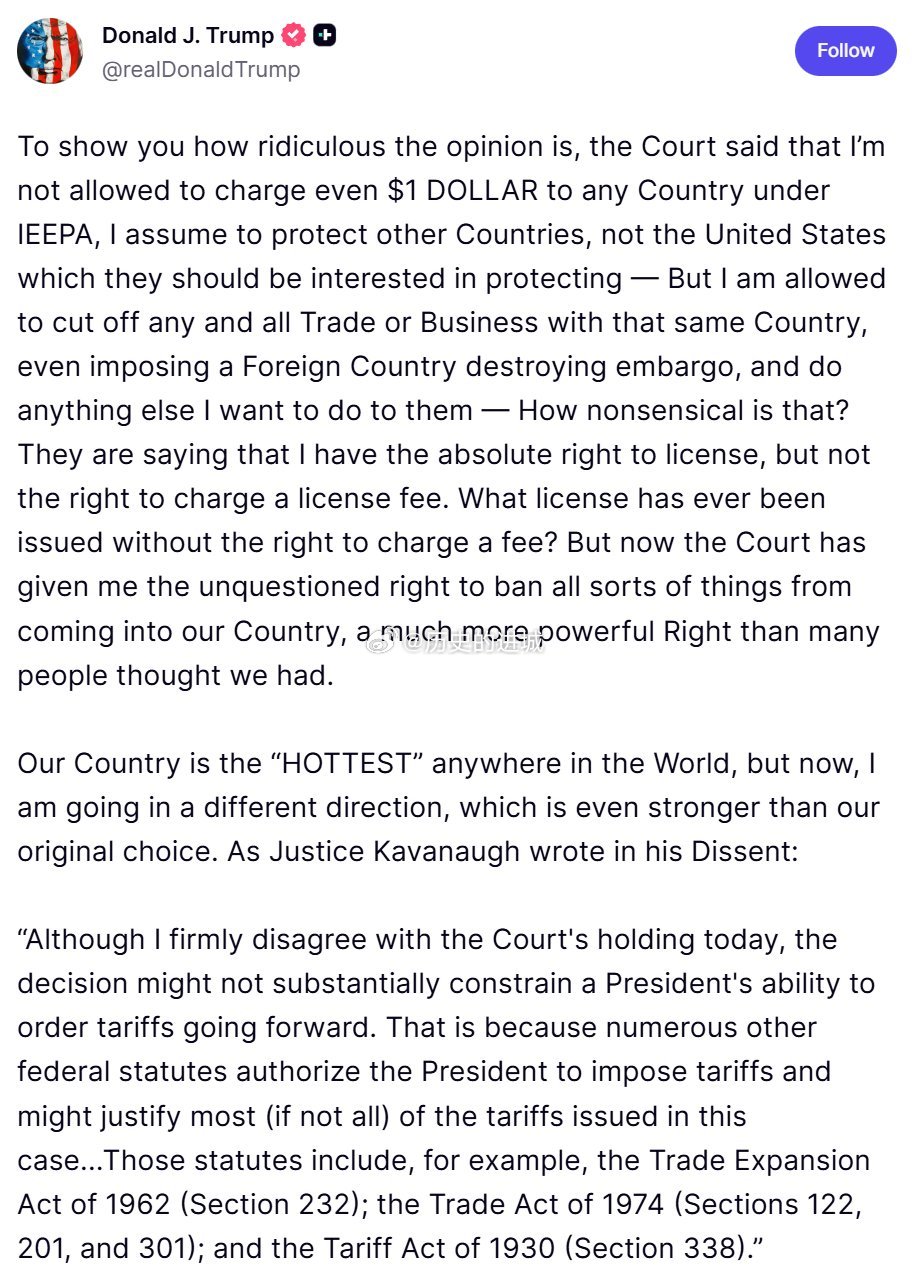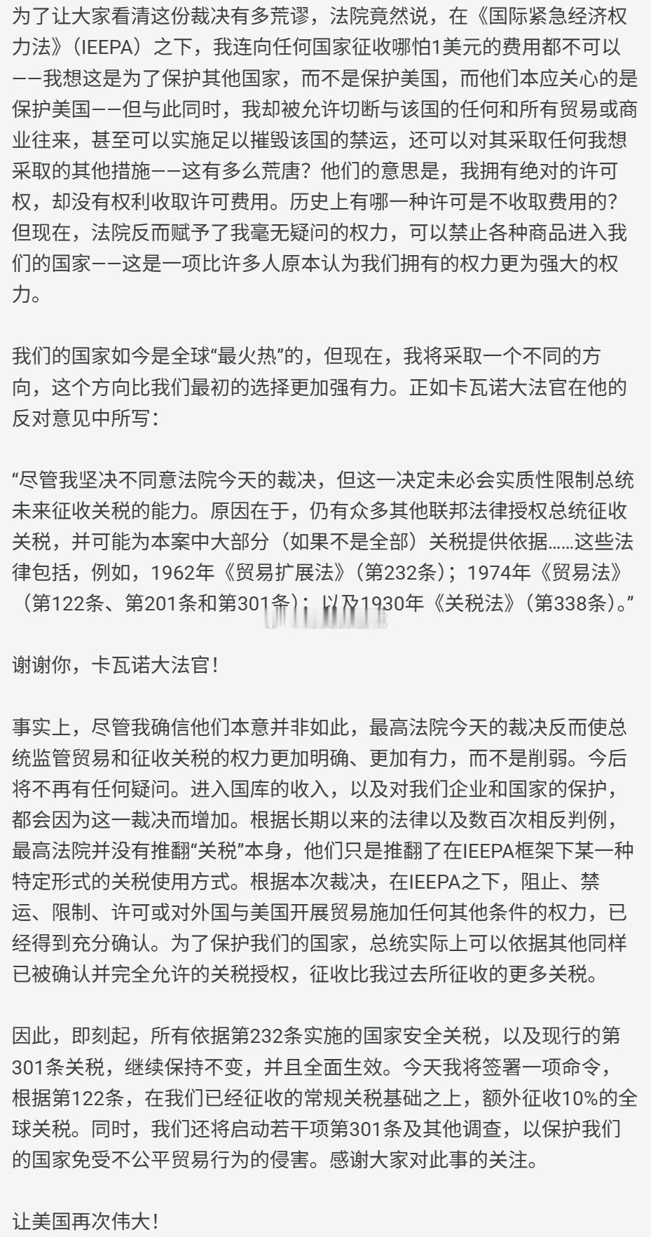 美最高法院裁定特朗普关税违法特朗普:最高法院关税裁决关乎经济与国家安全象征,IEEPA这条路被卡住也没关系,总统仍有更强的其他法律授权可用。海外新鲜事