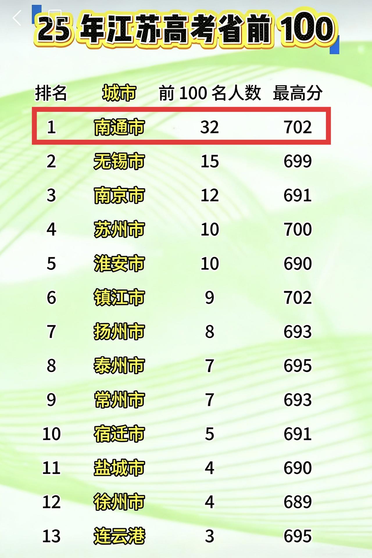 南通教育这么强的吗,2025江苏理科高考前100名,南通占32人,真是太厉害了。有人指出,这是因为南京、无锡、苏州等地很多优秀学生都走了保送,所以很多没有参加高考,是这个原因么?反正无论如何,南通教育在江苏都是走在前列的。