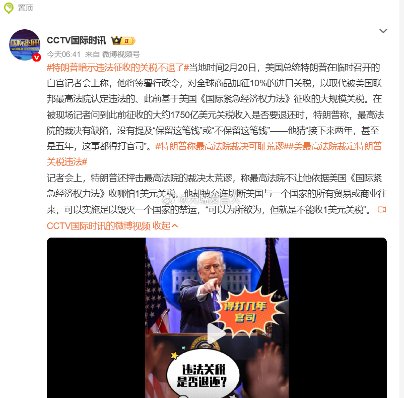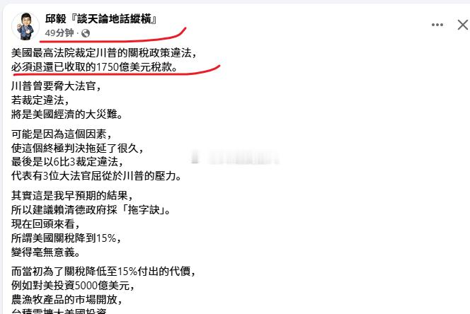 邱毅这是(图2),邱先生转述,“美国最高法院裁定川普的关税政策违法,必须退还已收取的1750亿美元税款。”图3,“在被现场记者问到此前征收的大约1750亿美元关税收入是否要退还时,特朗普称,最高法院的裁决有缺陷,没有提及“保留这笔钱”或“不保留这笔钱””邱先生是边看新闻、边脑补吗美国或需退还1750亿美元关税,特朗普暗示违法征收的关税不退了,特朗普称最高法院裁决可耻荒谬,美最高法院裁定特朗普关税违法,热点观点