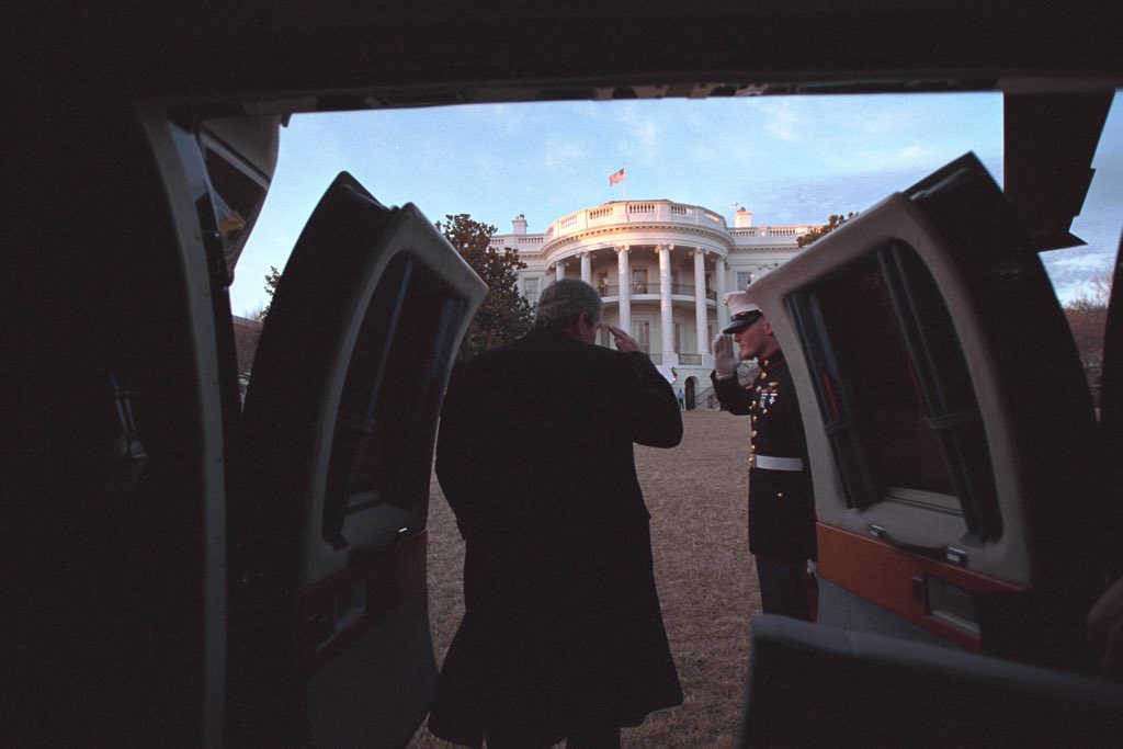 2001年2月4日。乔治·W·布什总统乘坐海军陆战队一号抵达白宫。