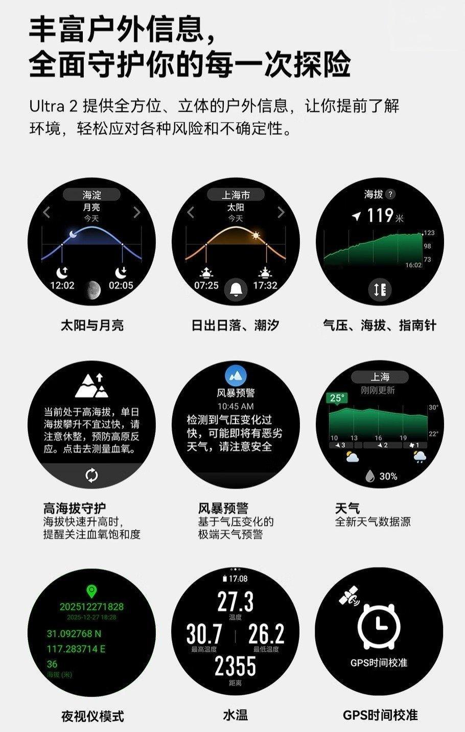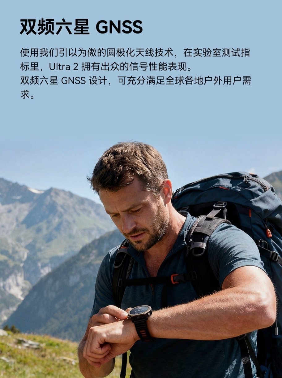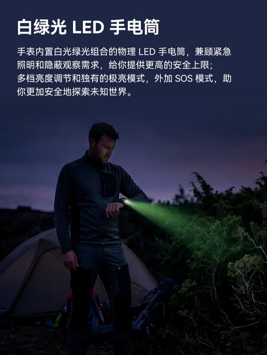 规格方面,这款手表内置 870mAh 电池,日常工作续航可达 30 天,搭载双频六星 GNSS 定位系统,具备免费地貌图,支持离线路径规划,不需要手机、网络就能够规划目的地路径、绕圈路线等。