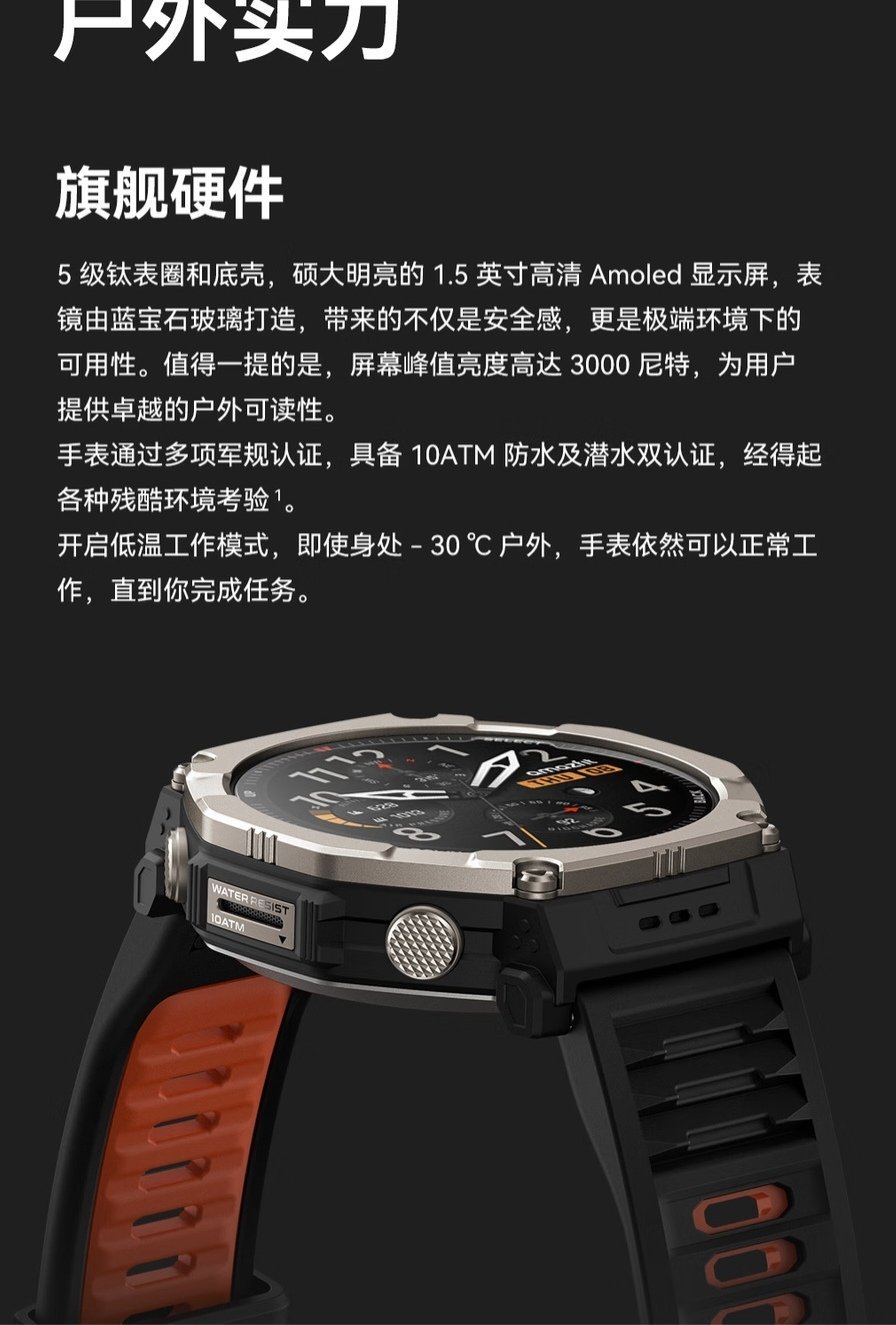 据介绍,这款手表搭载 1.5 英寸圆形 AMOLED 屏幕,峰值亮度可达 3000 尼特,覆盖蓝宝石玻璃,支持 10ATM 防水,可在零下 30 度的户外环境正常工作。