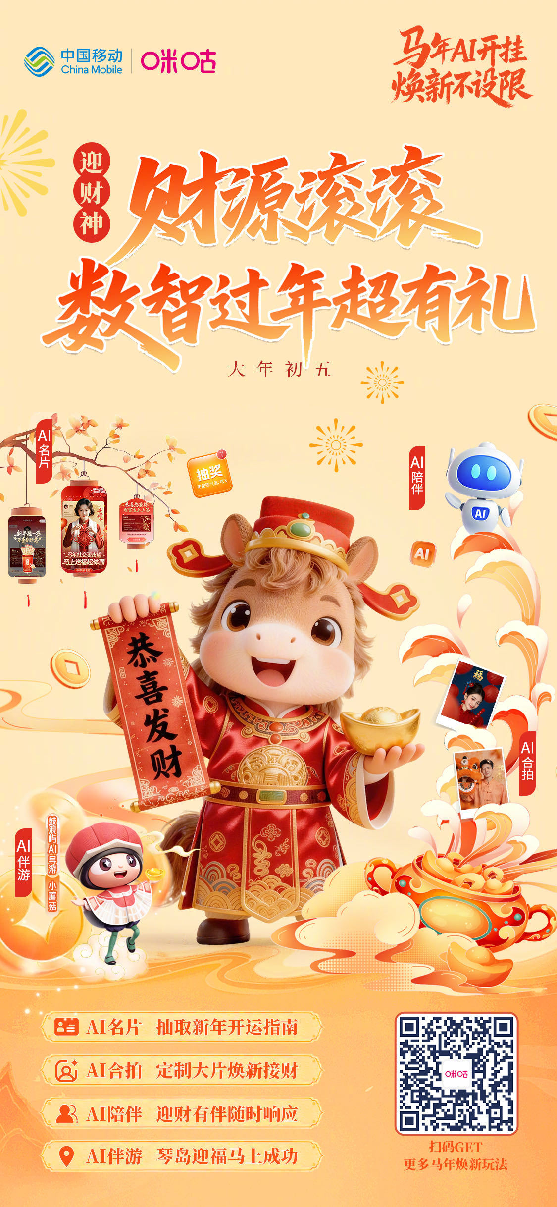 #马年AI开挂焕新不设限# 初五迎财神,数智接福超有礼!中国移动咪咕送上财运加持套餐:AI名片解锁开运签文,财运预报早知道;AI合拍定制接财写真,朋友圈迎财仪式感拉满;AI陪伴化身心灵树洞,随时畅聊释放压力,轻松迎财;AI 伴游带你云游琴岛祈福,马到成功纳财运~ 快来扫码接福,新的一年财运亨通!#2026来鼓浪屿把成功带回家#网页链接