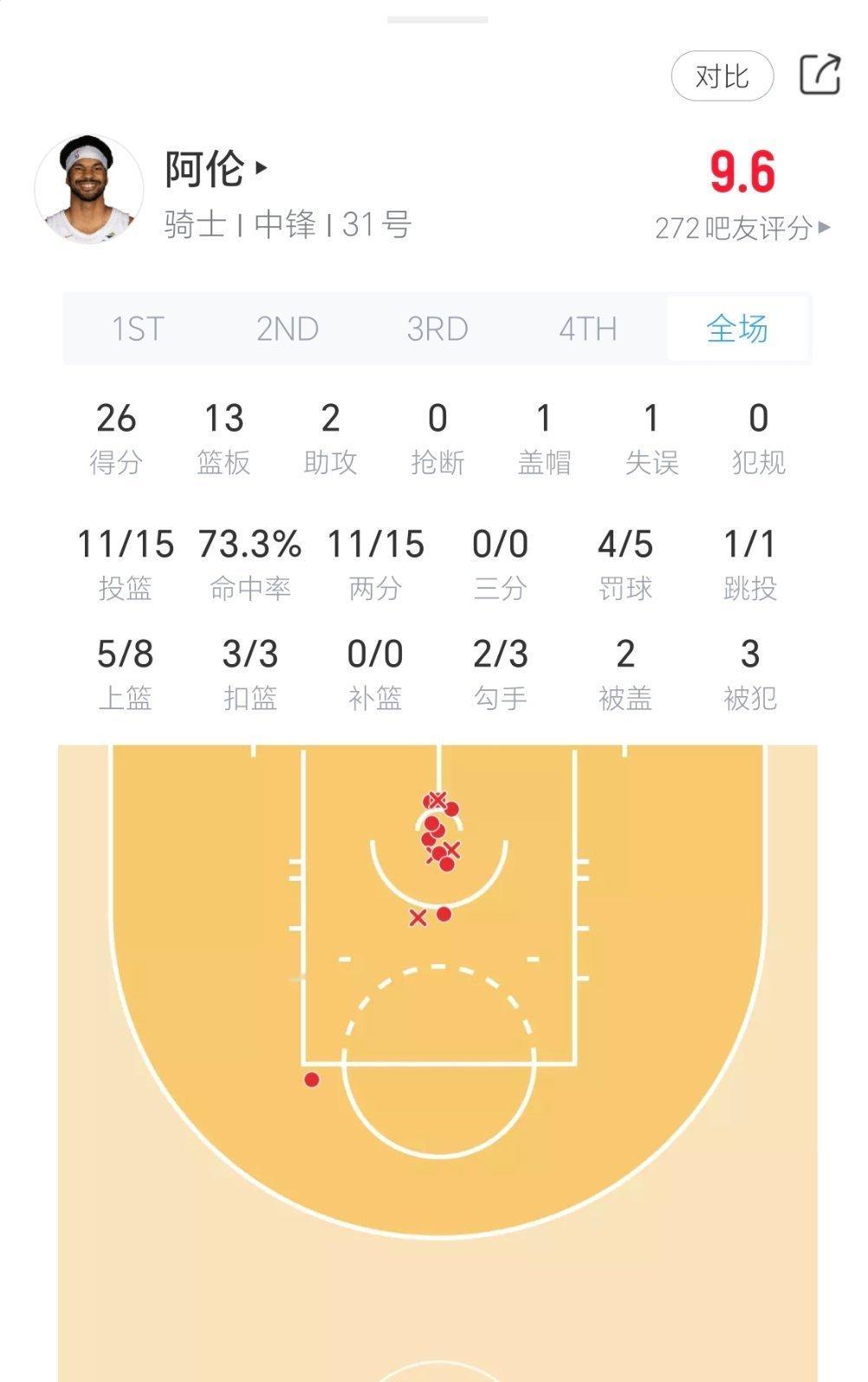 自搭档哈登以来,阿伦场均可以得到23分11篮板,投篮命中率超过75%! 骑士vs