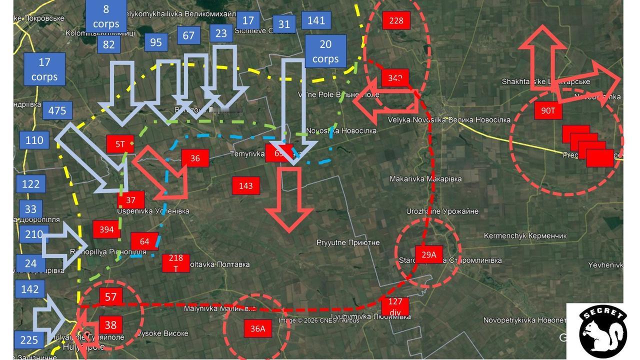 图文:俄乌两军前线兵力部署图 敌军情况 3个集团军 东北方向的第29集团军,约有2个作战旅 第36集团军,约有2个旅 南部的第5集团军,有2个旅和第127师 东部的第90坦克师已部署在原地 第57和第38师也已部署在原地 由于缺乏轮换和伤亡,所有部队的兵力应低于50% 友军情况 西部的第17军 西部的突击团(该区域内有5个) 北部和东北方向的第20军 总计最多5个旅 第8空中突击军 至少有2个旅参战 所有部队的兵力至少在50%左右,其中50%在后方休整,必要时可以调往前线