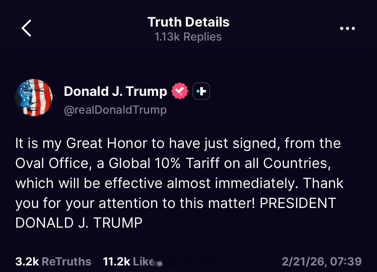 “我非常荣幸刚刚在椭圆形办公室签署了一项针对所有国家征收 10% 全球关税的法令,该法令将很快生效。感谢大家对这件事的关注!”
