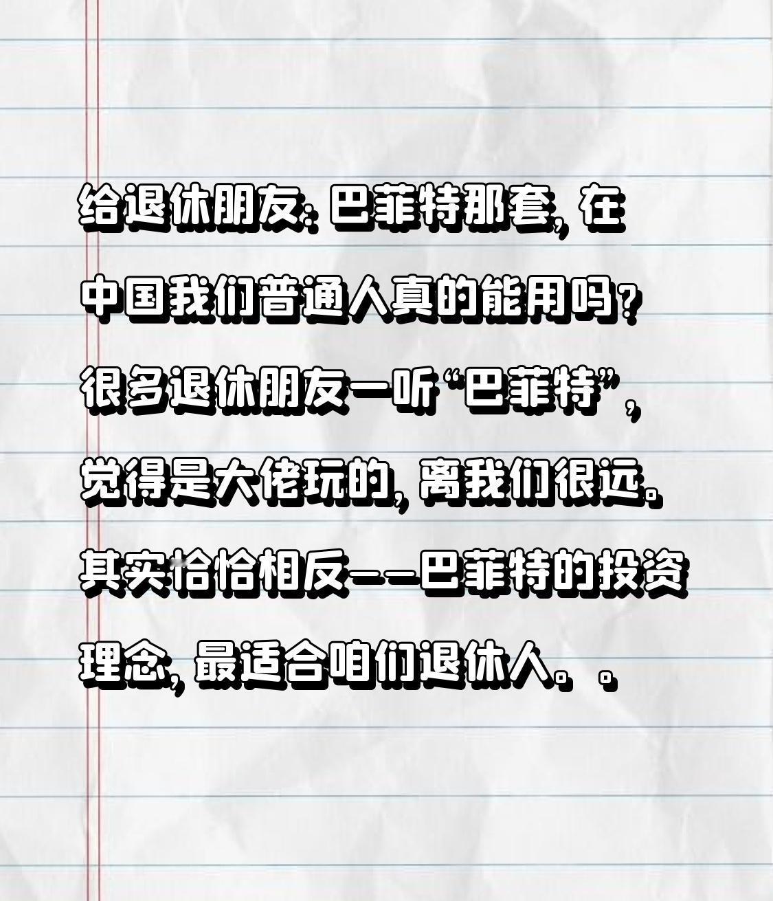 给退休朋友:巴菲特那套,在中国我们普通人真的能用吗? 很多退休朋友一听“巴菲特”,觉得是大佬玩的,离我们很远。 其实恰恰相反——巴菲特的投资理念,最适合咱们退休人。 他一辈子讲的就是:不冒险、不折腾、不盯盘、稳稳赚钱、睡得踏实。 这正是我们退休生活最需要的。 今天就用最直白的话,跟大家说清楚: 巴菲特理念,在中国,我们退休人能不能落地? 一、巴菲特真正的核心,不是炒股,是“稳” 巴菲特从来不是靠追涨杀跌赚钱,他的道理总结起来就三句: 1. 不懂的不碰 2. 不借钱、不加杠杆 3. 长期拿着,少操作 这三条,在中国完全能用,而且特别适合退休人。 二、为什么说巴菲特理念,最适合咱们退休朋友? 我们退休人投资,不求大富大贵,只求三点: 安全第一、不操心、稳稳有收益。 巴菲特的方法刚好全对上: 1. 不用天天看盘,一年看几次就行 2. 不用研究复杂K线,不用盯消息 3. 不追热点、不炒概念,只做稳稳的事 4. 风险低、波动小,不会晚上睡不着 可以说: 巴菲特不是写给年轻人的,是写给我们想安稳过日子的人。 三、巴菲特理念,在中国能落地吗? 完全能! 但我们不学他几十亿的操作,只学最适合普通人的部分: 1. 不炒股,买稳健基金 退休人不碰个股,只买债基、指数、高股息,稳稳当当。 2. 长期拿着,不频繁买卖 买完放着,越折腾越亏,不动反而赚得稳。 3. 先保证不亏,再谈收益 我们不求10%、20%,只求4%—7%稳稳收益,比存银行强,还安全。 4. 闲钱投资,绝不赌身家 这是巴菲特最看重的,也是我们退休人的底线。 在中国市场,稳、慢、简单、长期,一定能行。 四、给所有退休朋友一句最实在的话 我们这个年纪,稳稳的幸福,比什么都重要。 巴菲特那套听起来高大上, 落到我们退休人身上,就是: 不操心、不盯盘、不冒险、稳稳赚、安心养老。 巴菲特理念,不是神话,是我们普通人最该用的投资方式。 在中国,能做、能行、能稳稳拿到收益。