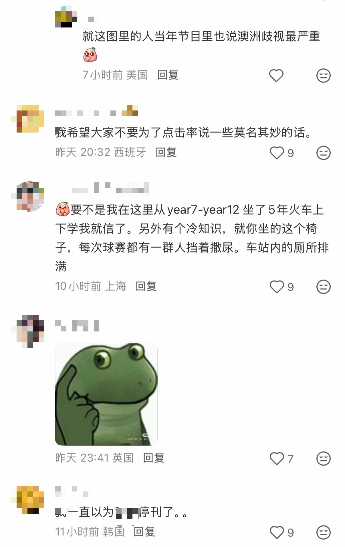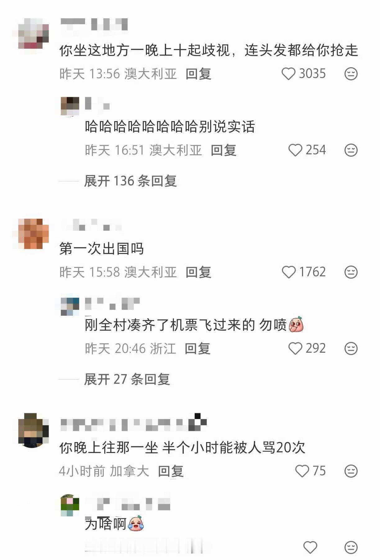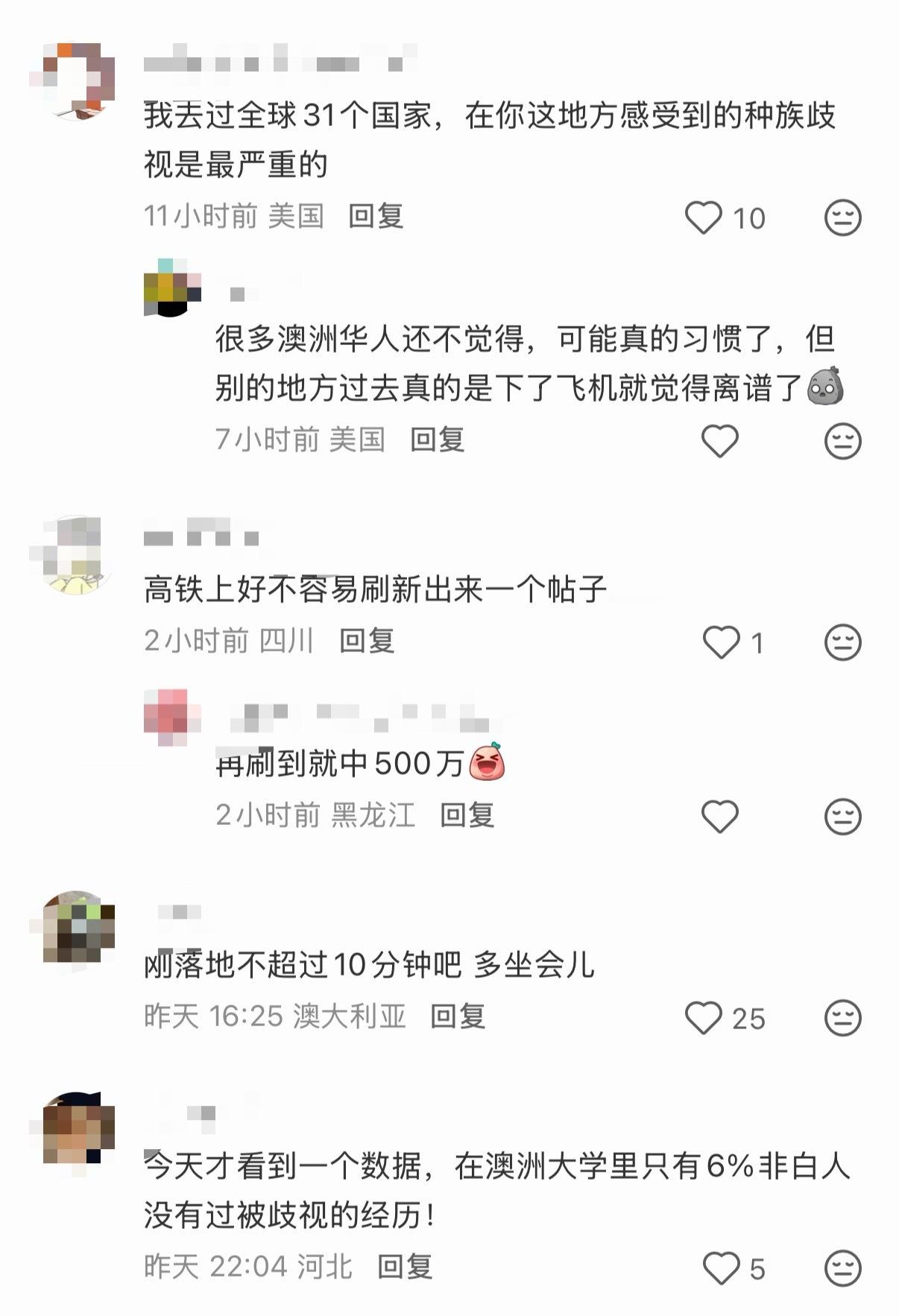 🔻网友在澳大利亚分享:“世界上唯一没有歧视的地方。”🔻网友在澳大利亚回复:“你坐的这个地方是刷怪笼 ,我平时尽量不在这里多呆”、“要不是我在这里从year7-year12 坐了5年火车上下学我就信了。另外有个冷知识,就你坐的这个椅子,每次球赛都有一群人挡着撒尿。车站内的厕所排满”、“你坐这地方一晚上十起歧视,连头发都给你抢走”。🔻看评论区各种海外ip,苦澳村久矣?🔻一条中立发言都找不出来啊……热点现场海外新鲜事