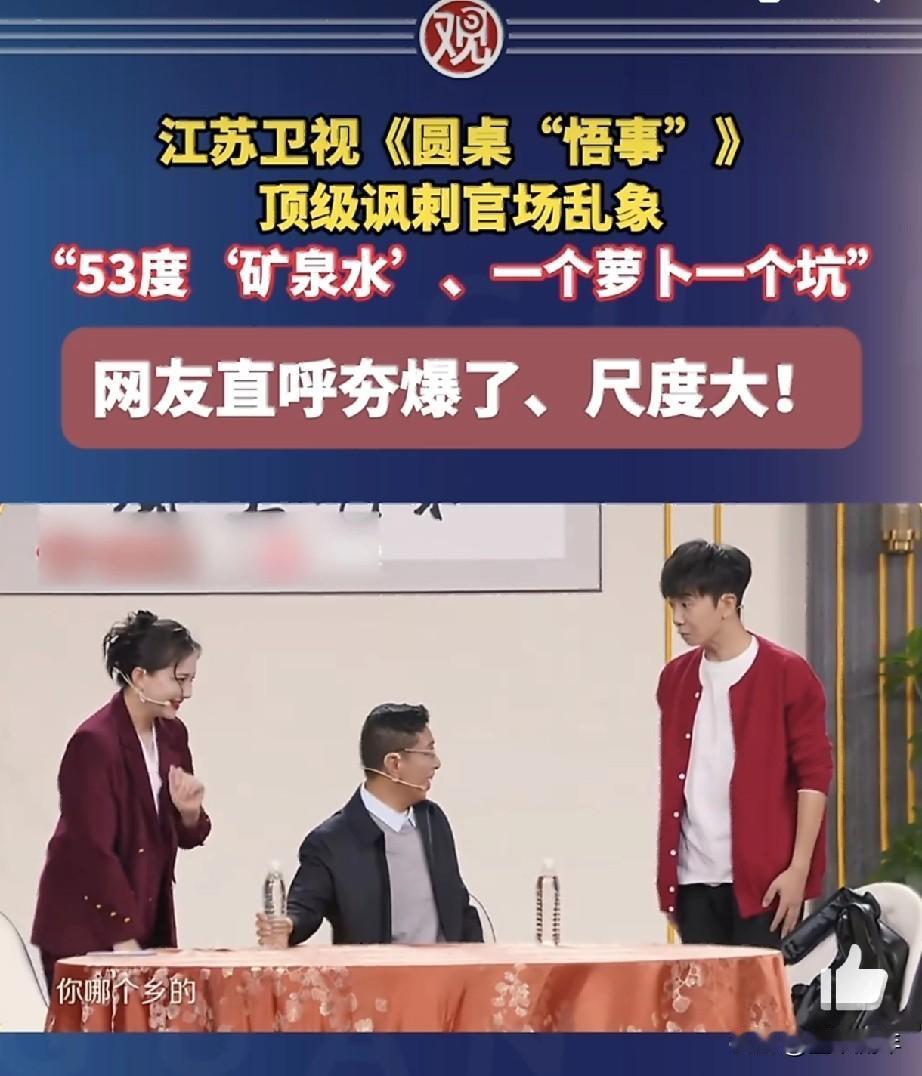 不愧是“苏大强”,江苏卫视2026年春晚小品《圆桌“悟事”》,直接把“尺度”焊死在热搜上。这部由贾旭明、孙茜等人主演的作品,以一场饭局为切口,把官场潜规则扒得明明白白:“53度矿泉水”暗指用矿泉水瓶装的茅台,“一个萝卜一个坑”则讽刺招聘里的“萝卜岗”,直接戳中了无数人的职场痛感。 网友更是炸了锅,直呼“这都能过审?简直是春晚的一股清流!”有人笑完心酸:“台词句句是梗,笑完只剩扎心”;有人感慨:“这才是小品该有的锋芒,不回避现实,才是对观众最大的尊重。”