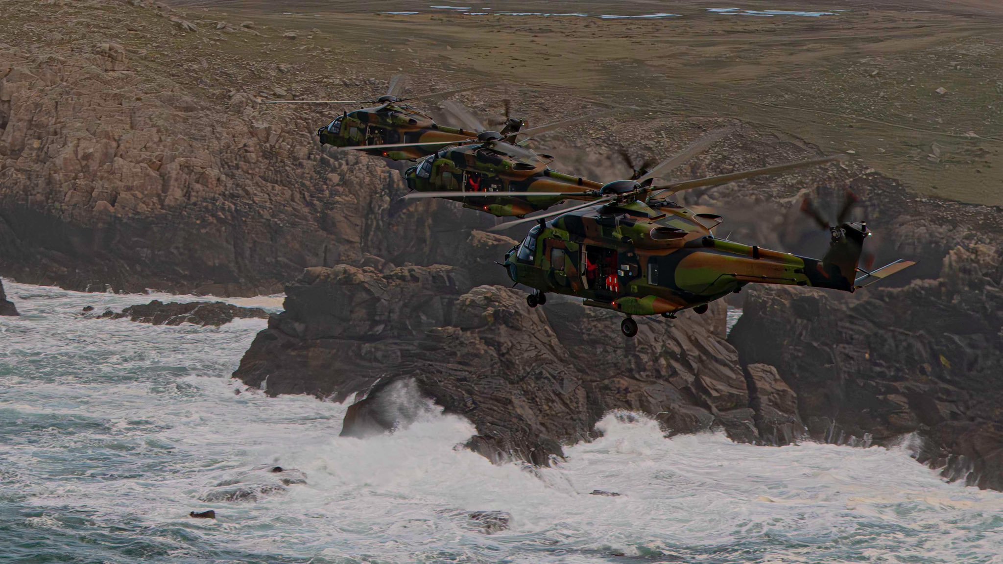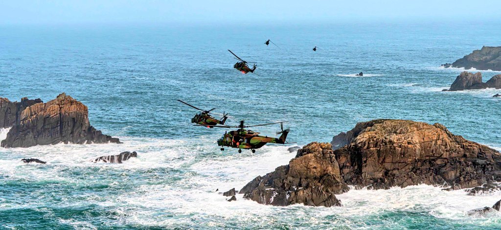 “猎户座-2026”演习,法国陆军航空兵第三战斗直升机团的NH90和小羚羊直升机正在布列塔尼海岸线执行任务