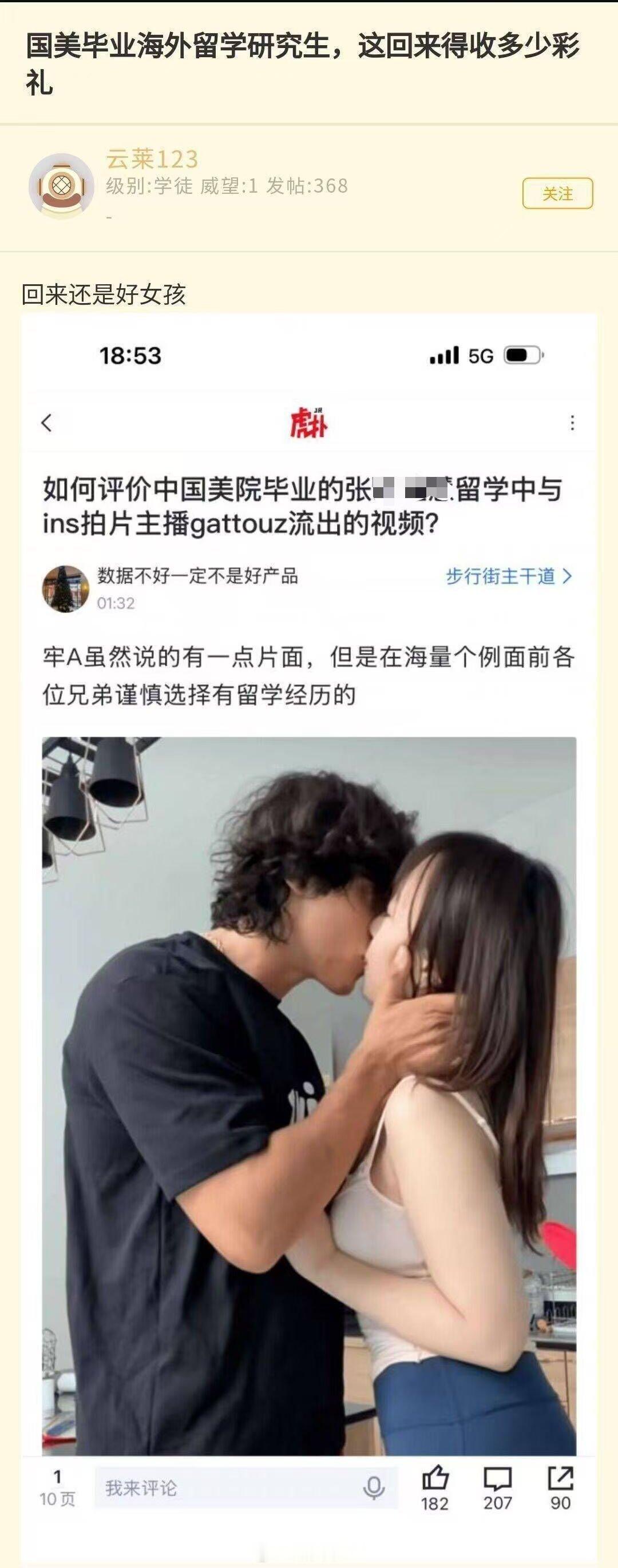 张某是海外留学艺术生,在自己主页发跟成人片男网红的约会,结果那个老外网红直接就把她给卖了,把她们人与人连接的视频发到网上。。。。。呵呵,要是她父母看到了,不会认为这是好事吧