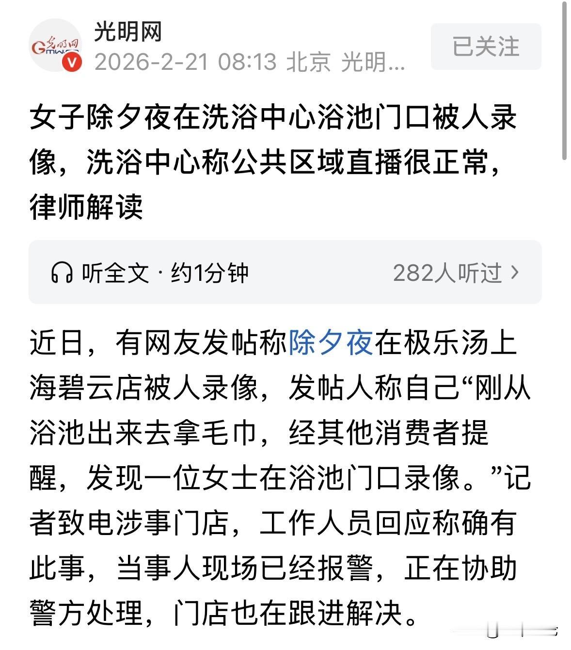 “太离谱了!”上海,女子除夕夜去洗浴中心洗澡,从浴池出来后,她一丝不挂去拿毛巾,结果旁边一大姐让她赶紧给自己挡严实了,说浴池门口有工作人员拿着手机录像呢!女子瞬间花容失色,裹上毛巾就去质问对方,这才得知工作人员竟在直播,女子觉得隐私全无,气得报警,可店家却觉得女子小题大做,说直播不是很正常吗? 除夕夜里,一家浴场里热气腾腾。 忙碌了一年的女子小张(化名),想着除夕夜泡个澡去去晦气,好好放松一下。 当时小张刚从滚烫的浴池里爬上来,一丝不挂,正低头在池边找拖鞋,准备去拿干毛巾擦身子。 就在这时,旁边一位同样来洗澡的女子急匆匆走过,压低声音提醒她:那边有个女的拿着手机对着这边拍呢!赶紧把自己裹严实点。 这句话让小张鸡皮疙瘩都起来了。她猛地一抬头,果然看见浴池门口站着个陌生女士,手里举着手机,镜头正对着刚出浴的人群。 在这种刚洗完澡、衣衫不整甚至半裸的状态下,被人拿着镜头怼着拍,那种羞耻感和被冒犯的感觉瞬间直冲天灵盖。 “你干嘛呢!谁让你拍的?”小张当时火就上来了,顾不上自己还没擦干,裹着浴巾冲过去就质问。 拍摄者却说,自己是在直播卖浴场的票。 小张这下脸色更不好了。直播?那说明屏幕前有不少人都把她们刚出浴的模样看去了!这不是侵犯隐私权吗? 周围的浴客也围了过来,大家七嘴八舌地指责,场面一度很混乱。 小张忍无可忍报了警。警察来得很快,把涉事的女士带走调查,小张也去做了笔录。 本以为这只是个别人的素质问题,可小张回家后心里还是犯嘀咕,就把这事发到了网上。这一石激起千层浪,评论区里炸了锅。 原来,不止小张一个人遇到这事儿。好多网友在底下留言,说这家浴场,不止这一家店有问题,好几个城市的分店都在搞直播! 而且不是那种对着风景拍,是把摄像头架在休息大厅、甚至是公共区域的更衣室门口。 有网友说:我去过他们家另一家店,当时就觉得奇怪,休息区顶上架着个手机,红灯一闪一闪的,还以为是监控,结果工作人员说是在‘直播’。当时我就觉得浑身不自在,穿个睡衣走来走去都得端着,没想到真有人敢在浴池门口拍。 为了弄清真相,有记者专门打电话去涉事浴场。接电话的工作人员倒是没隐瞒,承认除夕夜确实有人在浴池门口录像,也承认报警了,正在配合警察处理。 但当记者问起“为什么公共区域会有直播”时,这位工作人员的回答让人大跌眼镜。 他非但没觉得这事儿有多严重,反而理直气壮地反问记者:那不是很正常吗?语气里透着一种“你们大惊小怪”的不耐烦。 正常?记者听完都愣了一下。在澡堂子这种涉及极度隐私的地方,把摄像头对准刚洗完澡的人,这叫正常? 面对记者的追问,工作人员又改口说:现在正在解决,正在解决。 在商家眼里,这可能只是一种宣传手段或者日常记,但在消费者眼里,这就是赤裸裸的隐私侵犯。 想象一下,你光着身子或者穿着极少的衣服,在毫无防备的状态下被不知道多少个陌生人在手机屏幕前围观、截图、甚至评论身材,这谁受得了?更别提有些人可能是带着孩子、老人来的,这种心理阴影不是一句“正在解决”就能抹平的。 总而言之,流量不能凌驾于人格尊严之上。 小张现在回想起那个黑黝黝的镜头,心里还是一阵恶寒。她不知道那段视频有没有被传出去,也不知道那个录像的人到底想干嘛。 而浴场那句轻描淡写的“很正常”,更像是一记耳光,打在所有重视隐私的人脸上。 《民法典》第1032条规定:自然人享有隐私权。任何组织或者个人不得以刺探、侵扰、泄露、公开等方式侵害他人的隐私权。隐私是自然人的私人生活安宁和不愿为他人知晓的私密空间、私密活动、私密信息。 虽然浴场大堂属于公共区域,但顾客在此处于更衣、沐浴后的特殊状态,身体暴露度高,属于“不愿为他人知晓的私密活动”的延伸保护范围。 根据法条,无论是其他顾客的恶意偷拍,还是商家未经显著提示的慢直播,只要未经同意记录并可能公开他人身体隐私或生活安宁,均构成对隐私权的侵害。 涉事工作人员认为公共区域直播很正常,是对法律的严重误读。法律保护的隐私不仅限于封闭空间,更包括特定场景下的私人生活安宁。 在本案中,浴场作为经营者,既未有效阻止他人偷拍,又擅自开启直播镜头对准人流密集区,未尽到安全保障义务。 依据本条,只要顾客能证明其处于不知情状态下被拍摄并处于私密活动场景,商家就必须承担停止侵害、赔礼道歉及赔偿损失的侵权责任。 对于这件事,你怎么看? 欢迎关注@一案一论